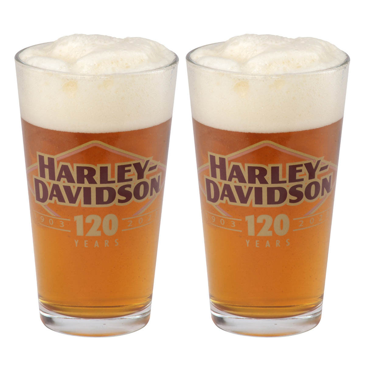 Harley-Davidson® 120th Anniversary 480 ml pintglazen. 120th Anniversary-logo op de voorkant en geëtst 120 Years op de achterkant. Alleen handwas.
