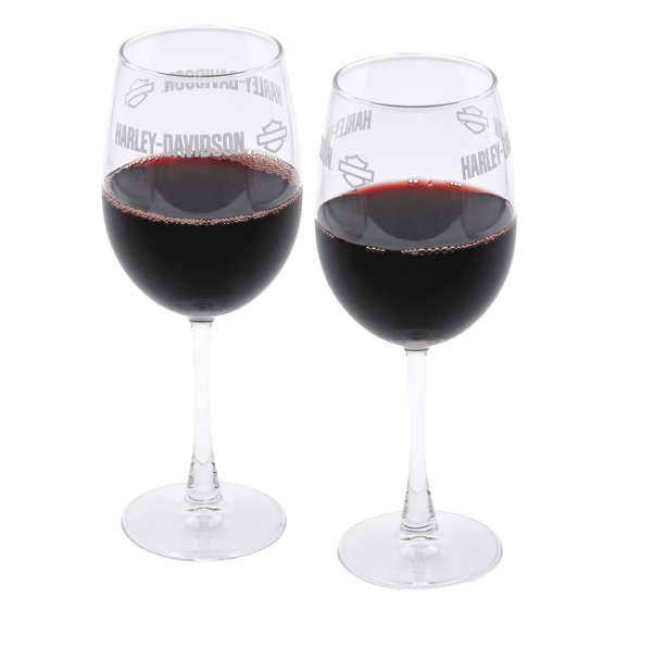 Set of two 15 oz. / 450 ml wine glasses with faux etched Harley-Davidson logo. Dishwasher safe.