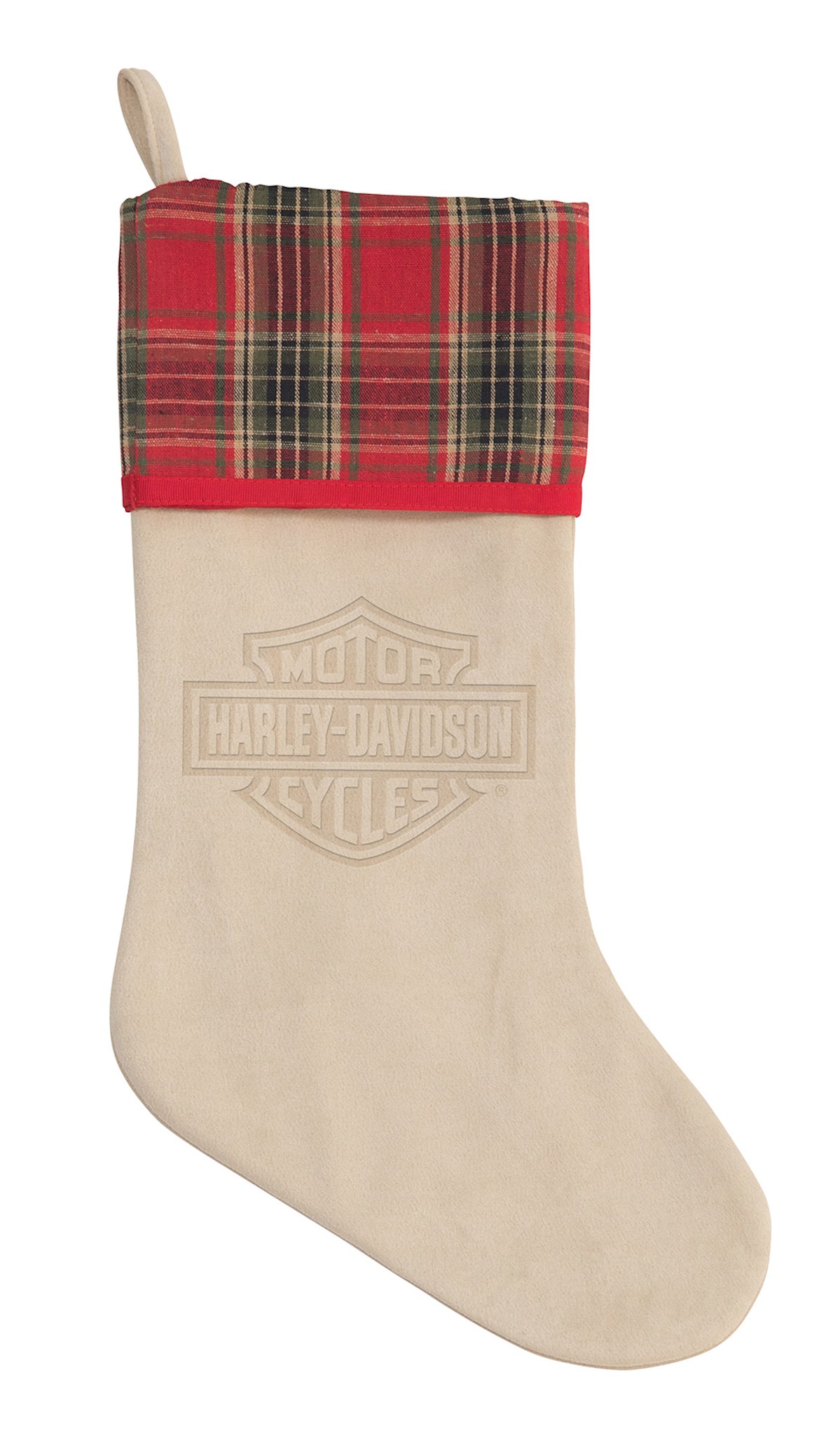 100% polyester cream faux suede holiday stocking with embossed Bar & Shield logo. Red, green, and cream plaid accent trim.