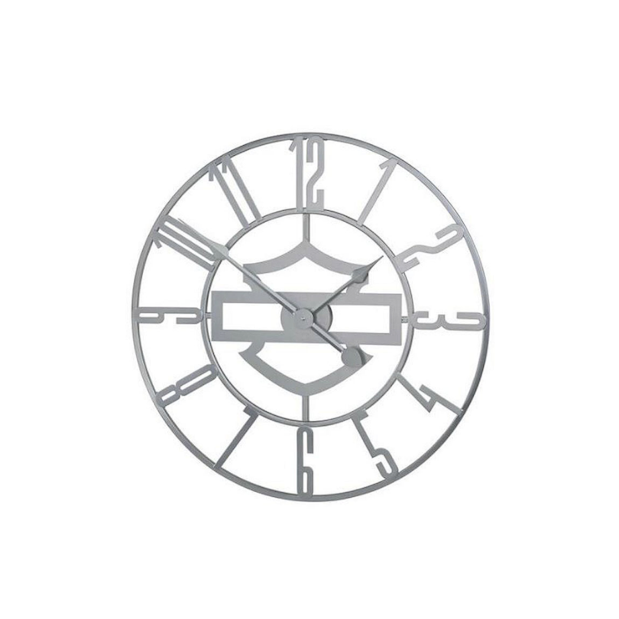 Harley-Davidson® Silhouette B&S Open Face Metal Clock - Silver, HDX-99214. Round metal clock with oversized numbers and silhouette Bar & Shield logo in center. Continuous sweep AA battery operated clock movement. Dimensions: 24" diameter.