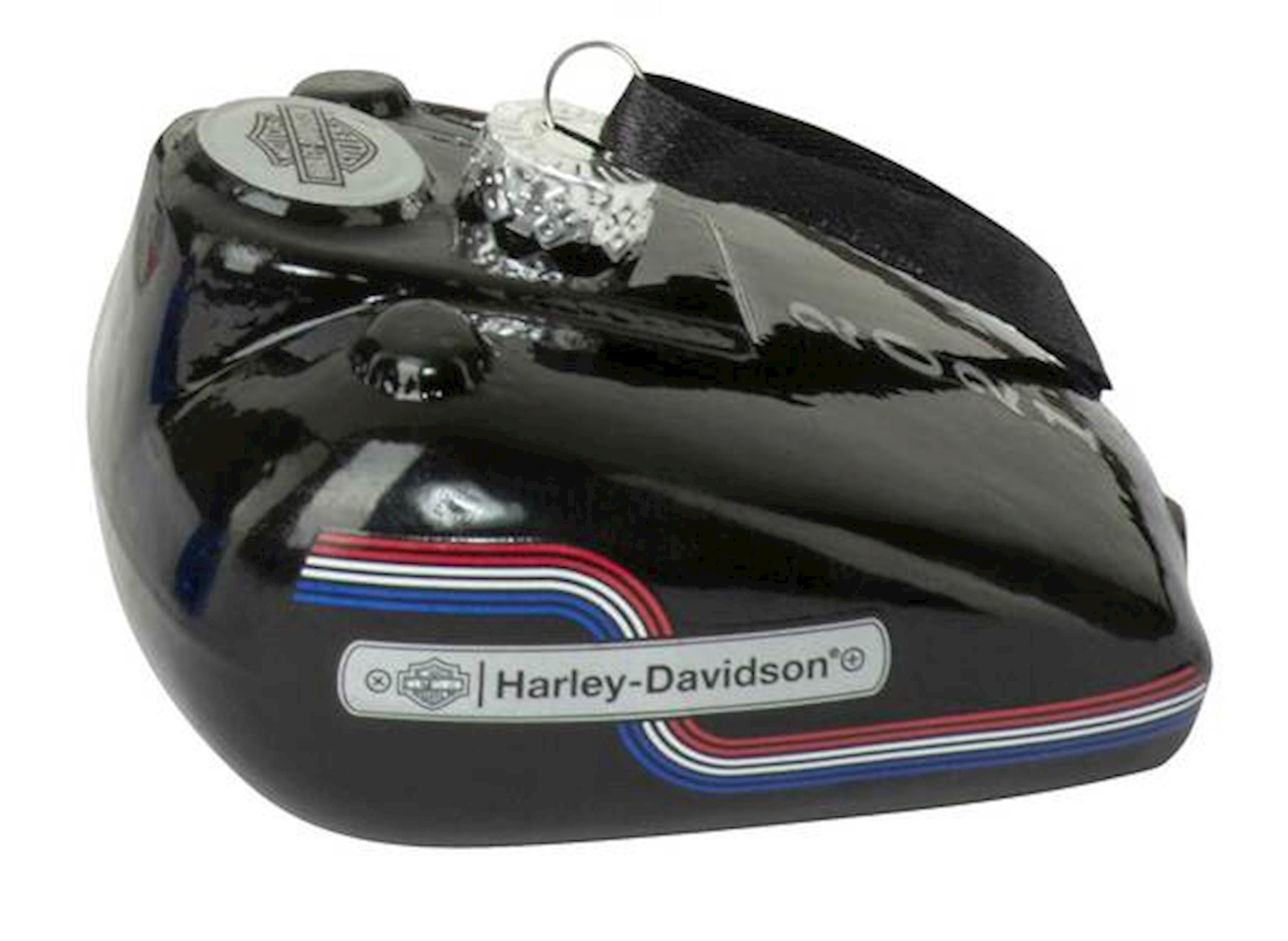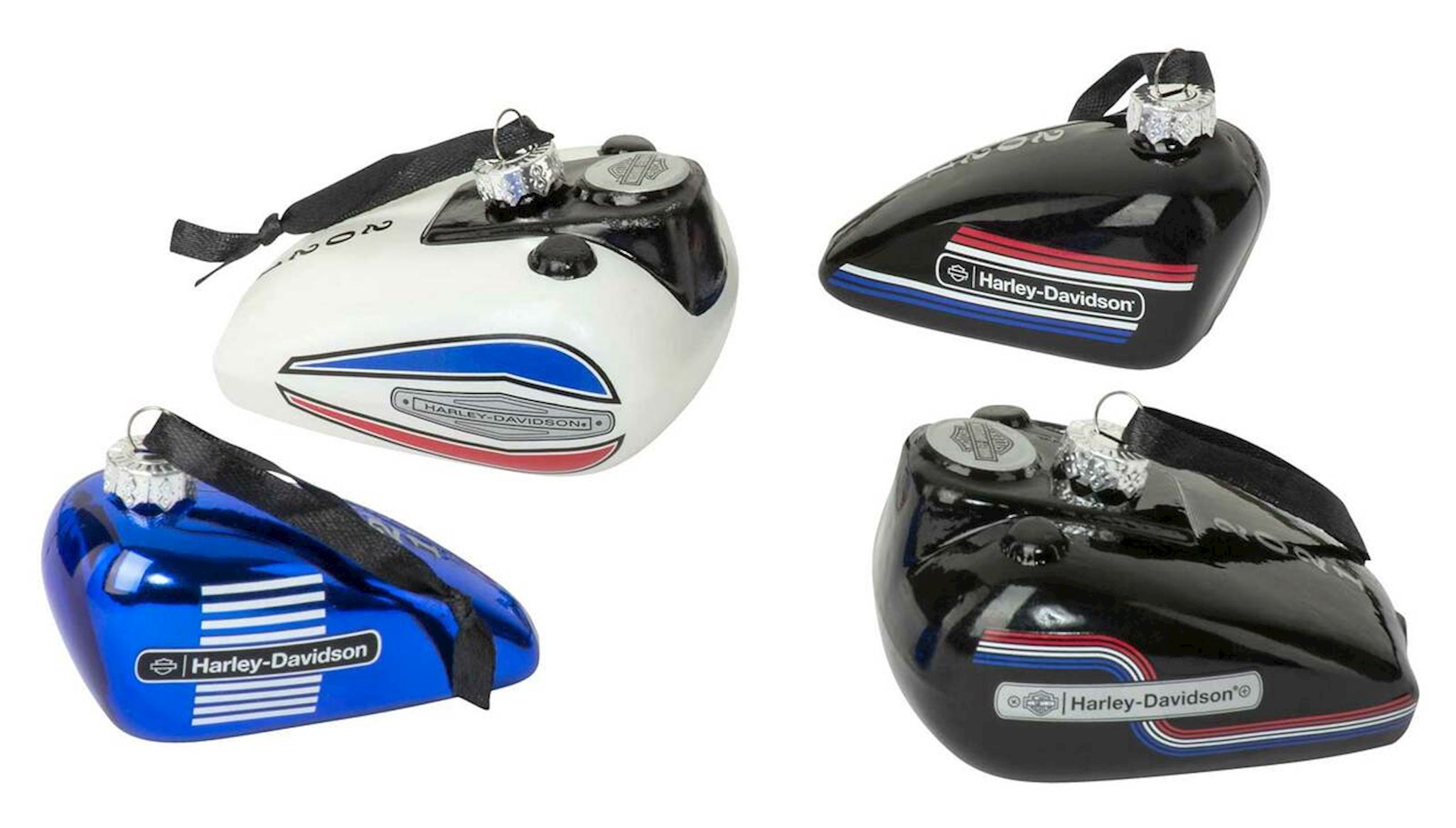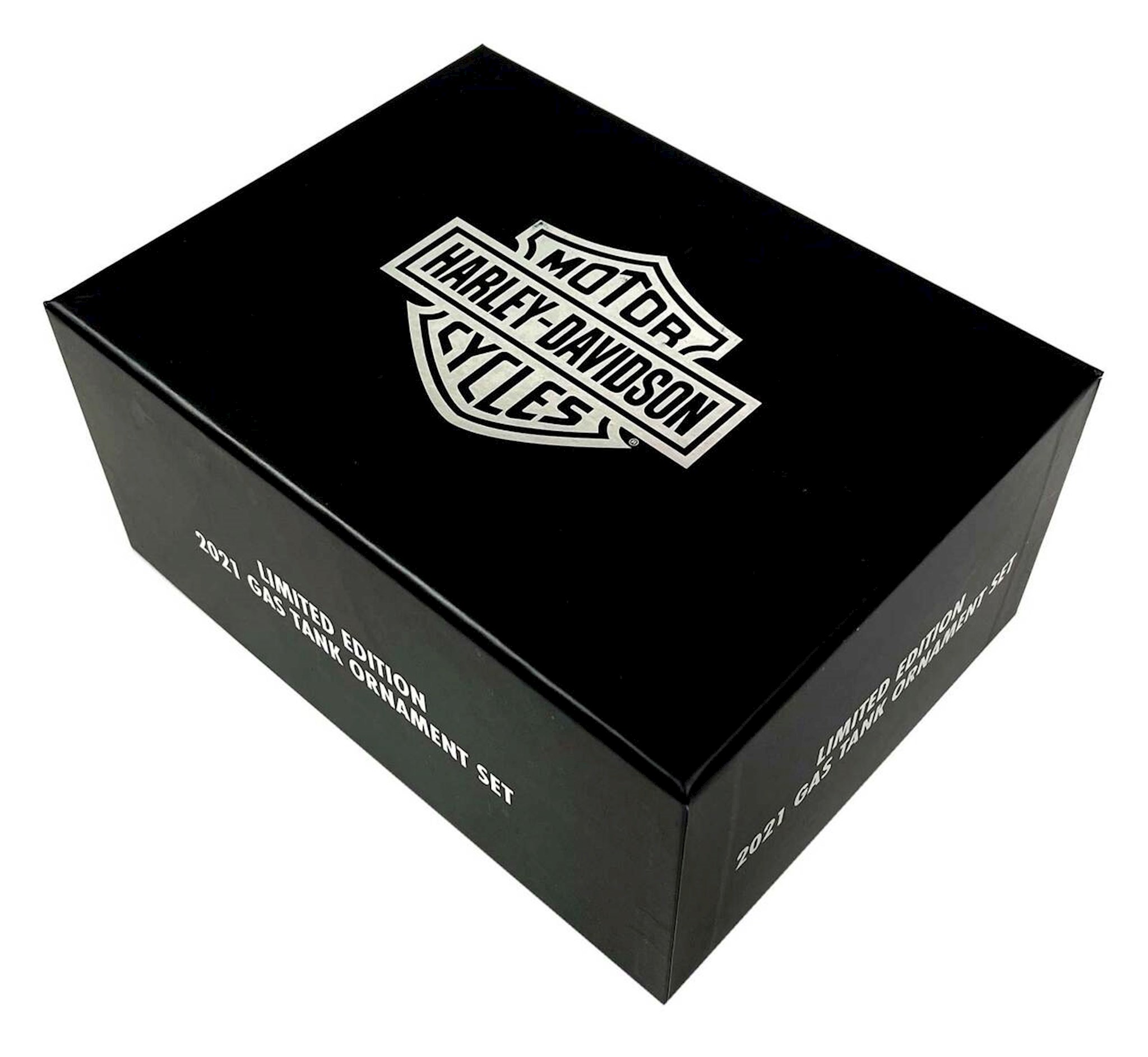 Harley-Davidson® Motorcycle Gas Tank Ornament Set, HDX-99217. Set of 4 ball blown glass Limited Edition Gas Tank Ornaments featuring retro graphics. Dated 2021. Deluxe retail packaging. Dimensions: 3.5" W x 1.9" H x 2.8" D.