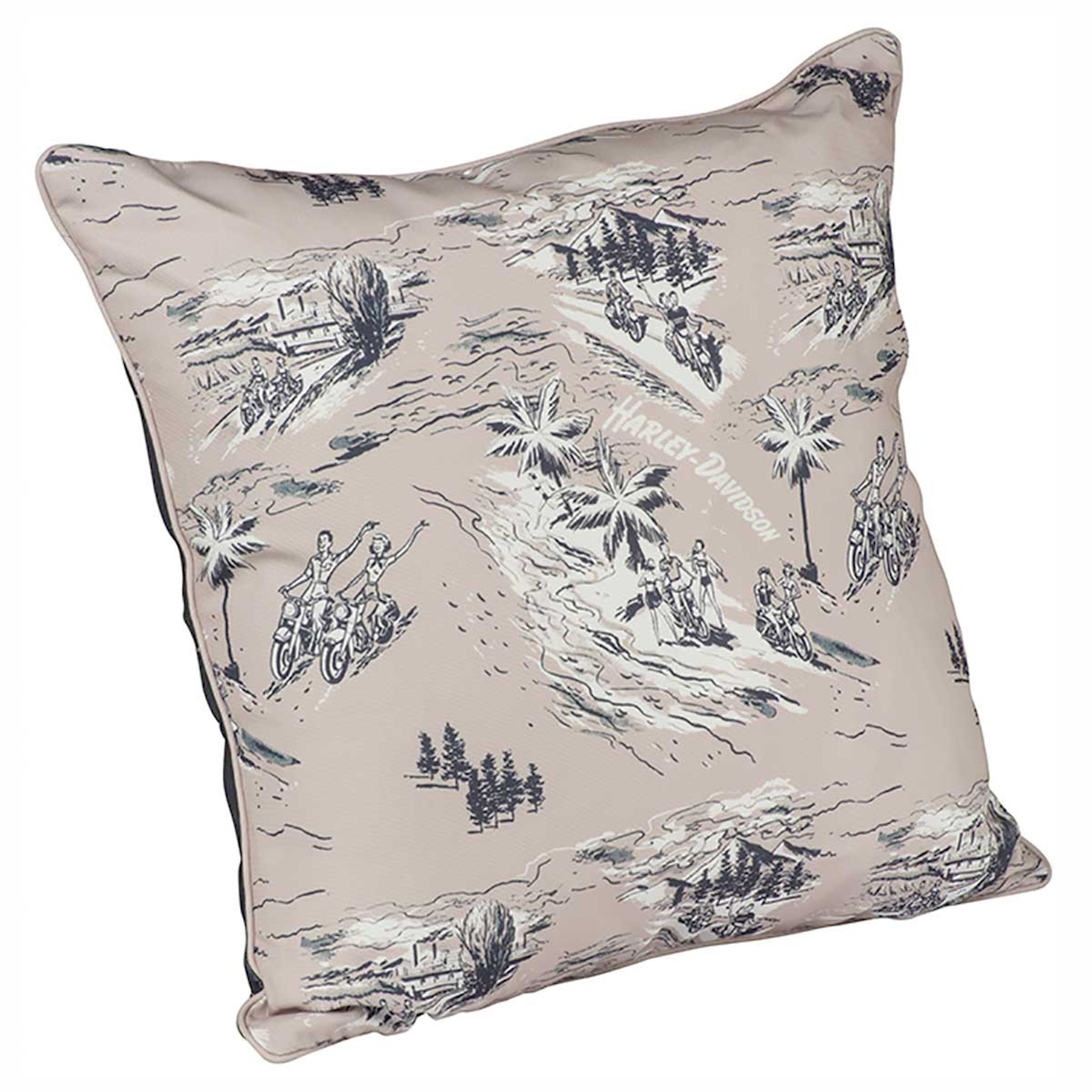 Polyester outdoor pillow features Celebration Harley graphic on one side and Harley-Davidson on the other. Water and fade resistant. Dimensions: 16" x 16" / 41 x 41 cm.