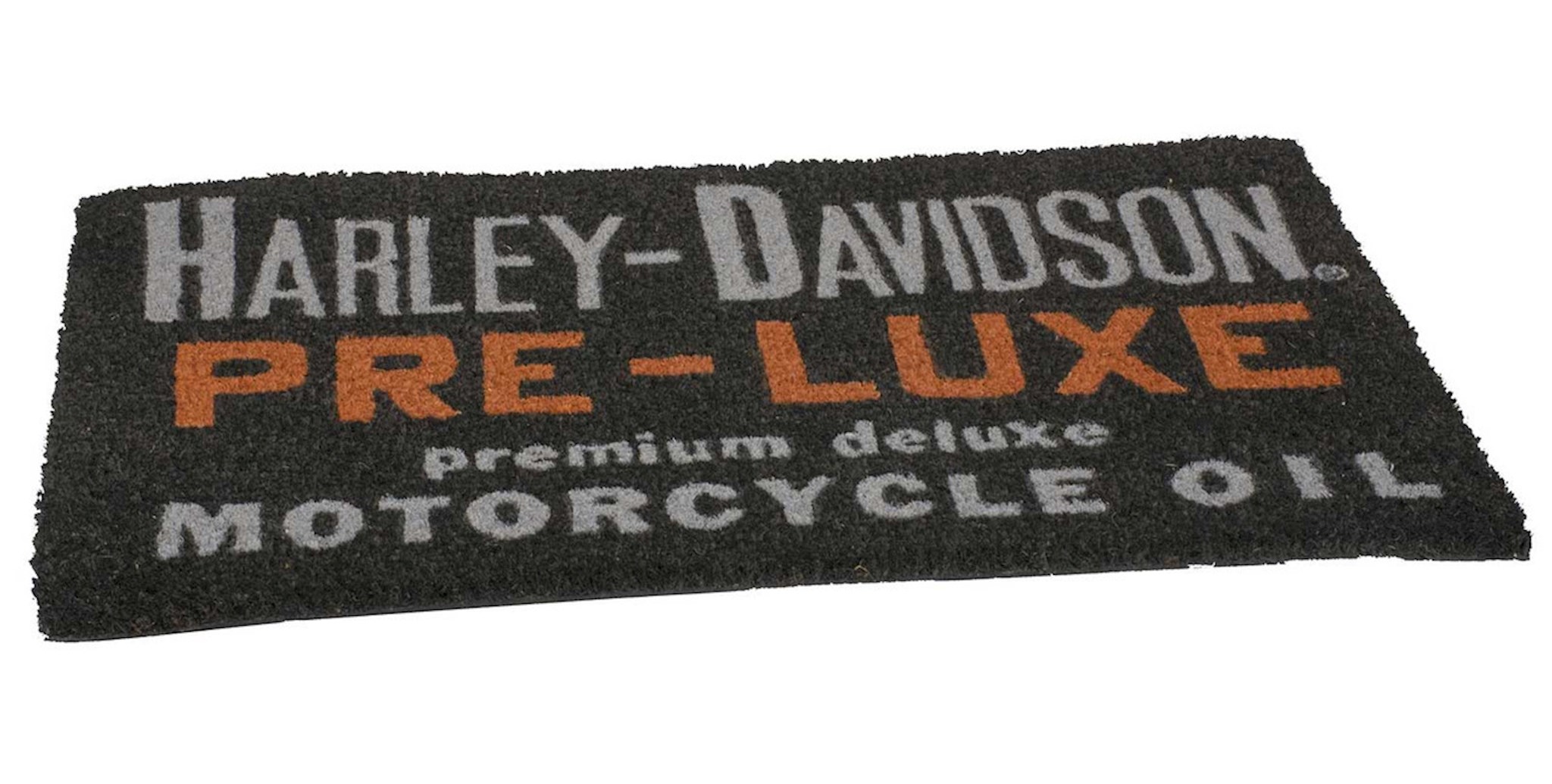 Harley-Davidson® Pre-Luxe Entry Mat - Black, HDX-99231. Durable coir entry mat with rubber backing. Features Harley-Davidson® Pre-luxe graphic. Dimensions: 30" W x 20" H. Making a statement at your door just got easier with this floor mat. This mat is designed to trap mud and debris to keep dirt outside. Designed promotes a safe, non-slip floor with a heavy-duty base for superior resilience and wear.