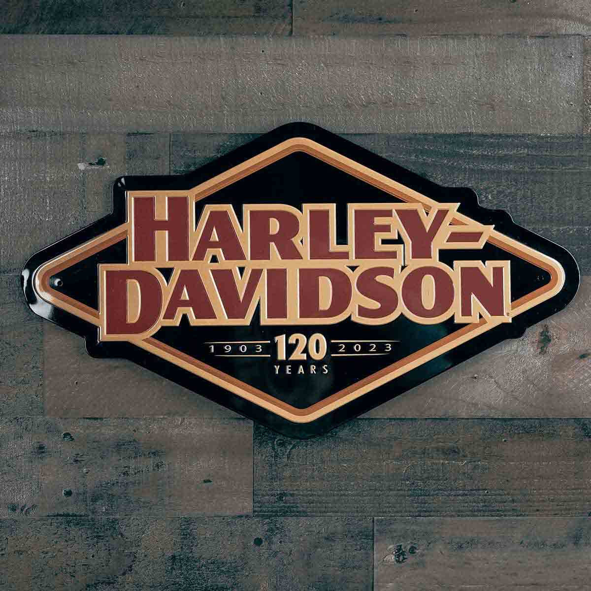 Harley-Davidson® 120th Anniversary blikken bord met reliëf. 120e verjaardagslogo. Gladde randen voor veilig gebruik. Inclusief gaten voor eenvoudig ophangen. Afmetingen: 21,5" B x 12" H / 55 x 30 cm.