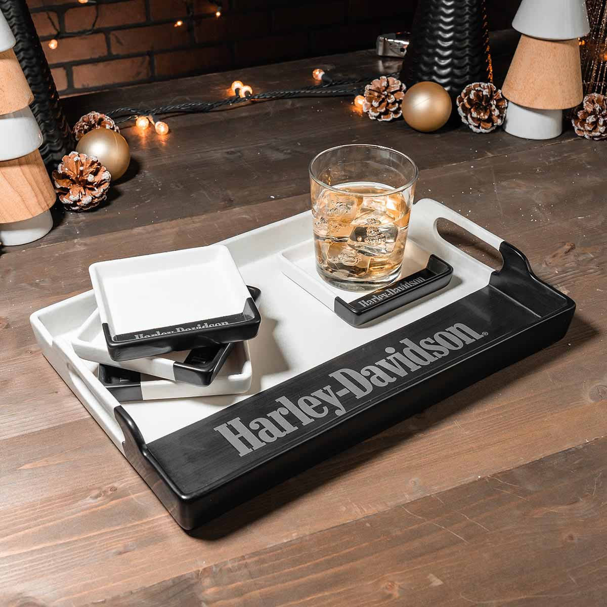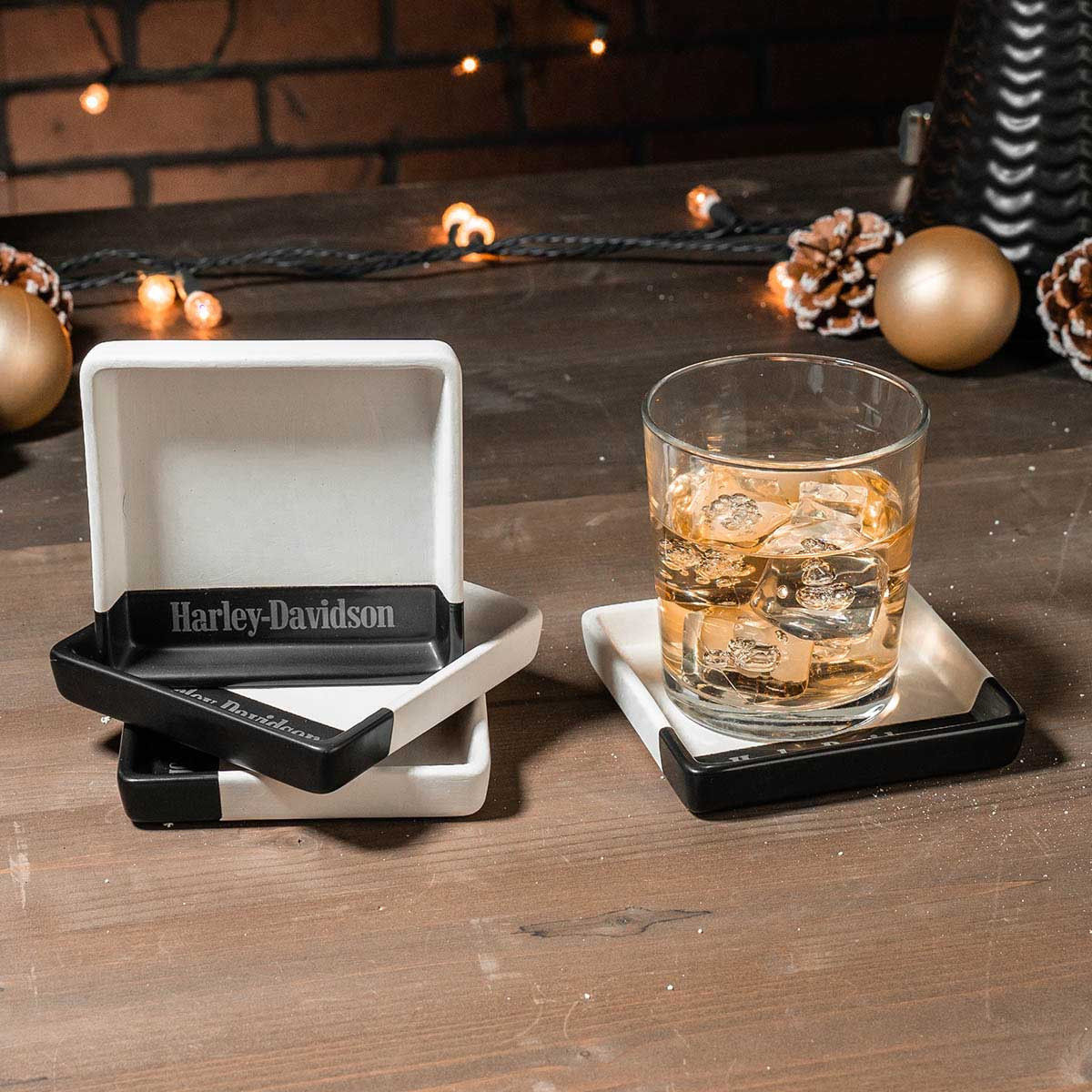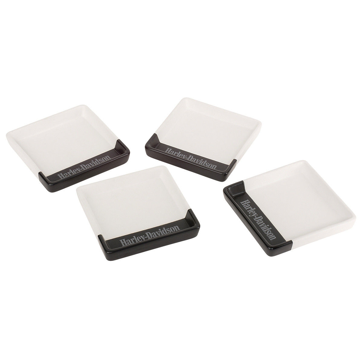 Set of four square ceramic coasters with white finish and black accent band. Grey Harley-Davidson logo. Hand wash only. Dimensions: 4" x 4" / 10 x 10 cm.