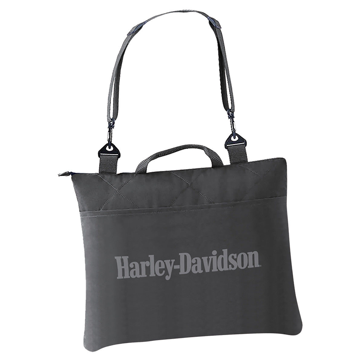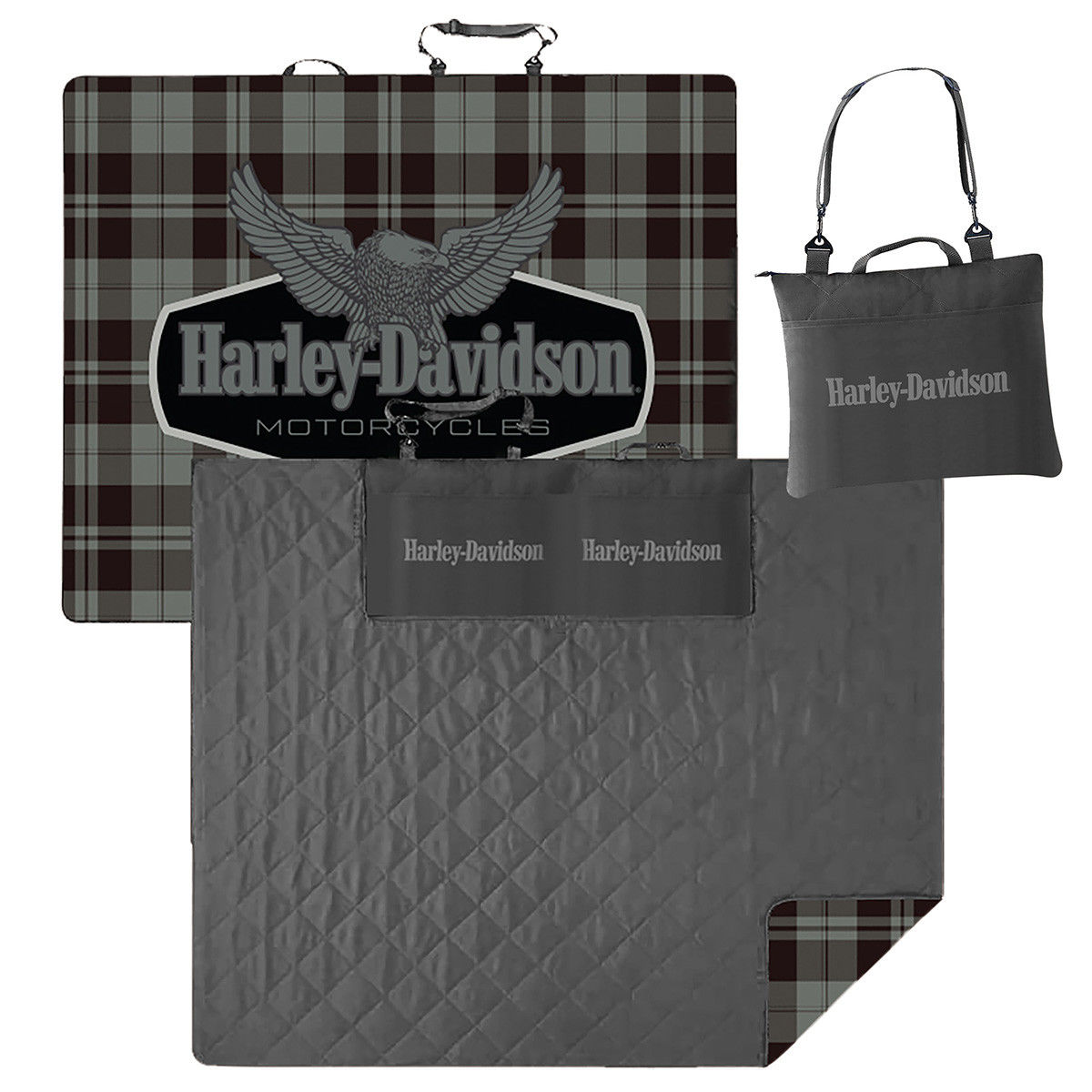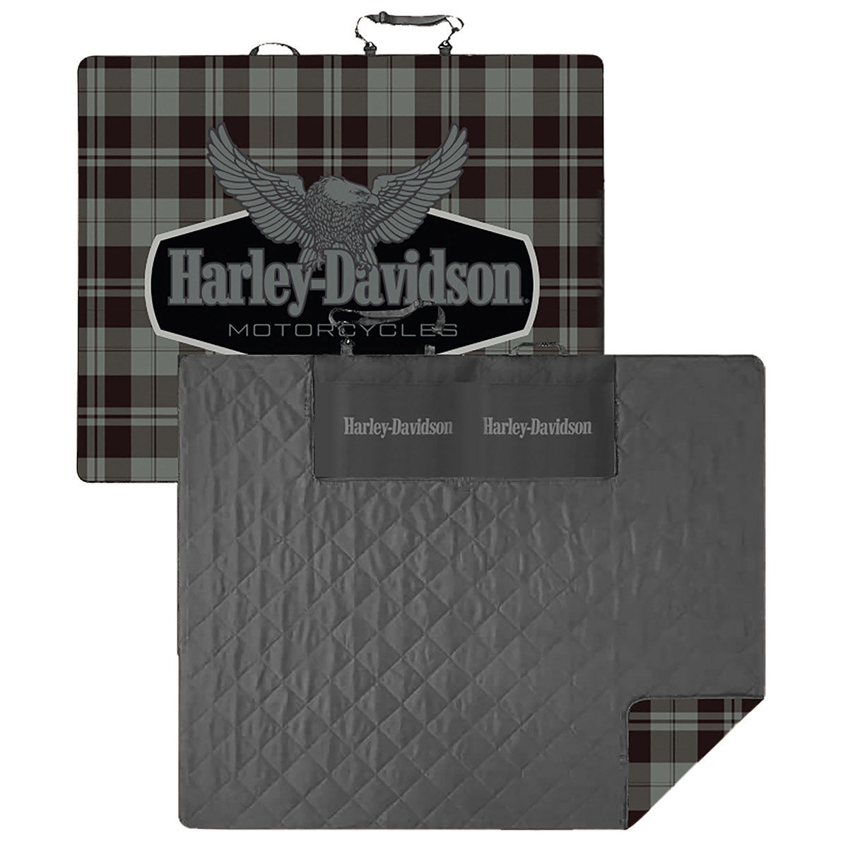 Soft polyester folding blanket with water resistant plaid taffeta front and grey oxford fabric backing. Features Harley-Davidson eagle graphic on front. Blanket folds into a convenient carry bag with Harley-Davidson logos on the front and back. Includes zipper closure and handles for easy transport. Dimensions: 67" W x 55" H / 170 x 140 cm.
