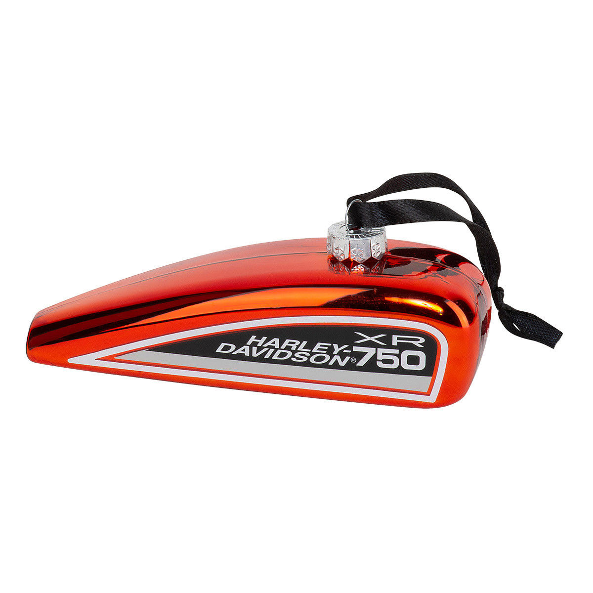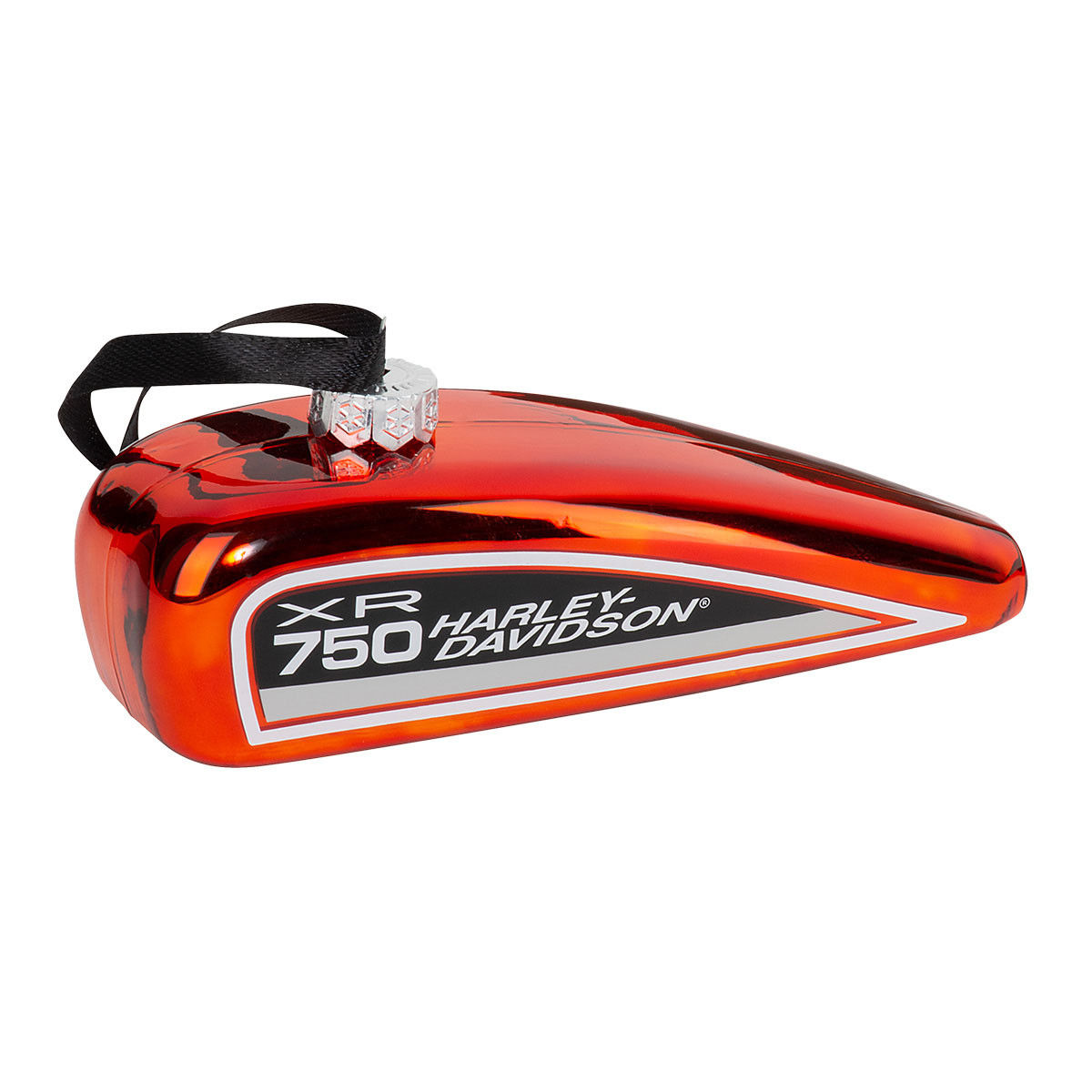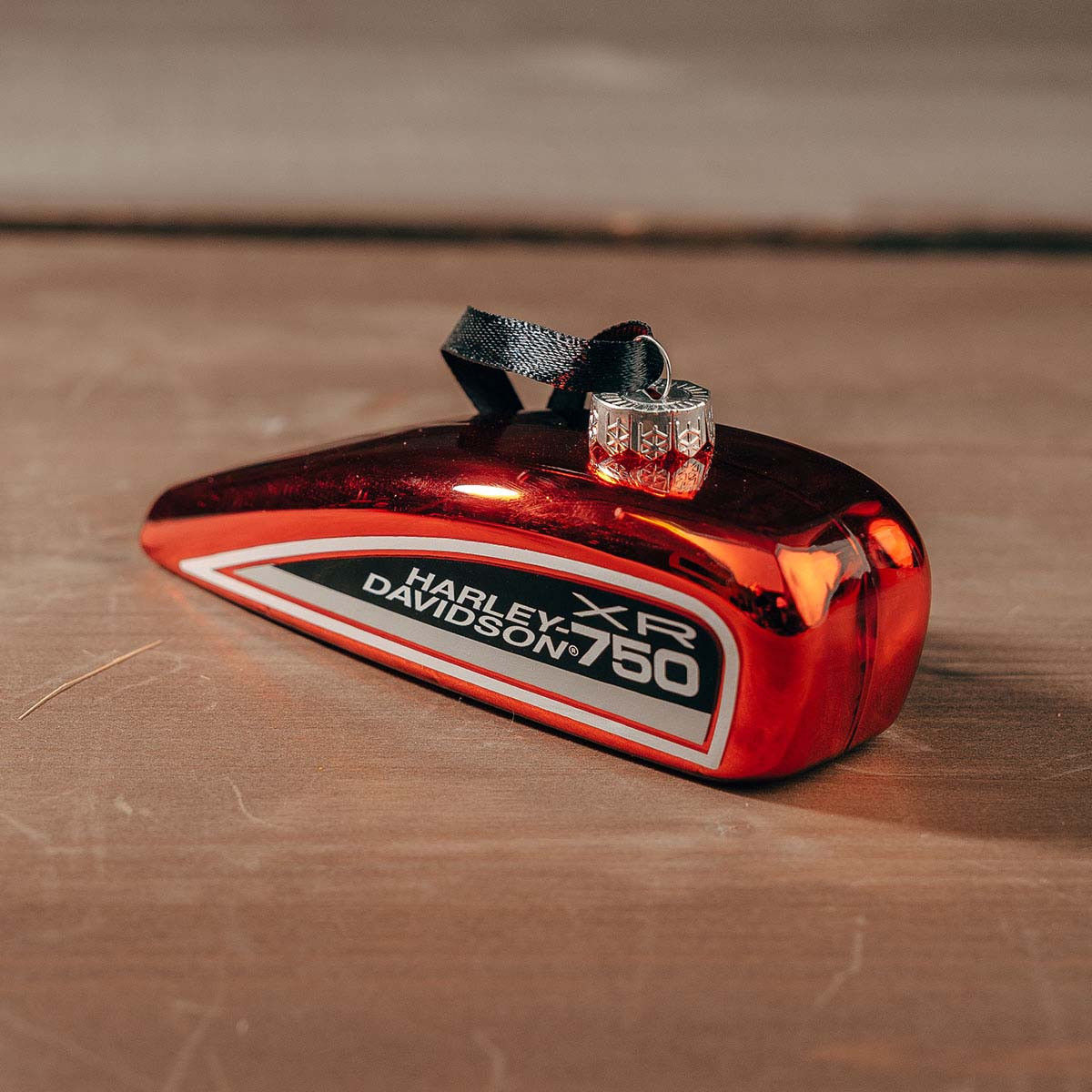 Blown glass gas tank ornament with XR-750 graphics. Dimensions: 4.4" L x 1.5" W x 1.7" H / 11 x 4 x 4 cm.