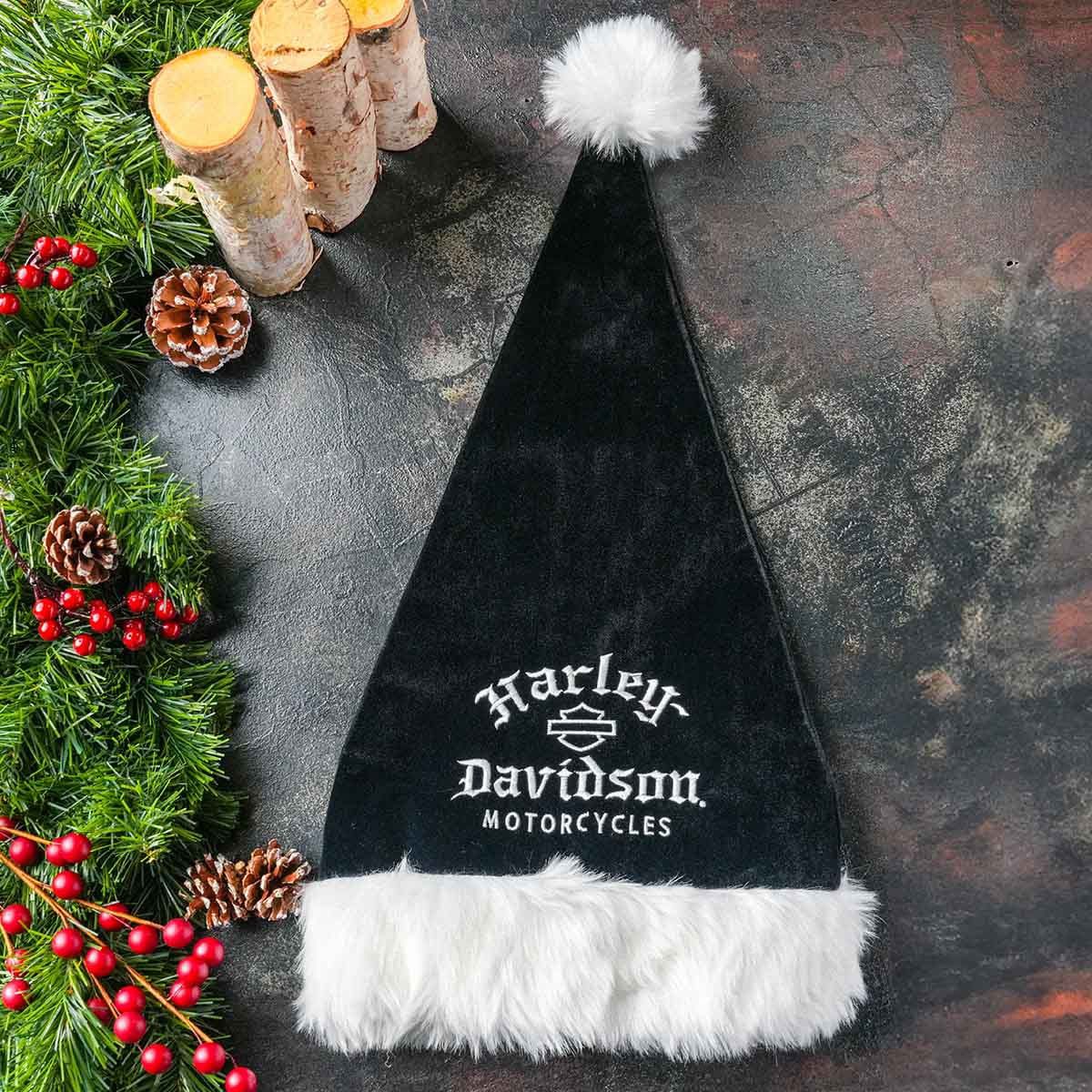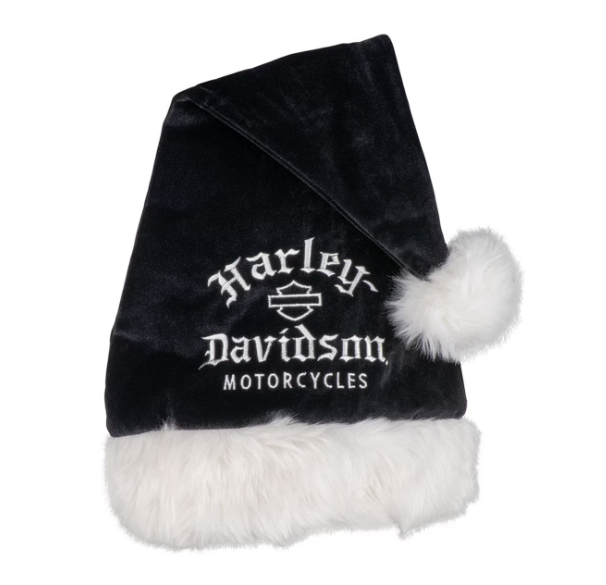 Velvet-feel Santa hat with white faux fur trim and elastic band. Embroidered Old English Harley-Davidson logo. Dimensions: 12" W x 21" H / 31 x 53 cm.