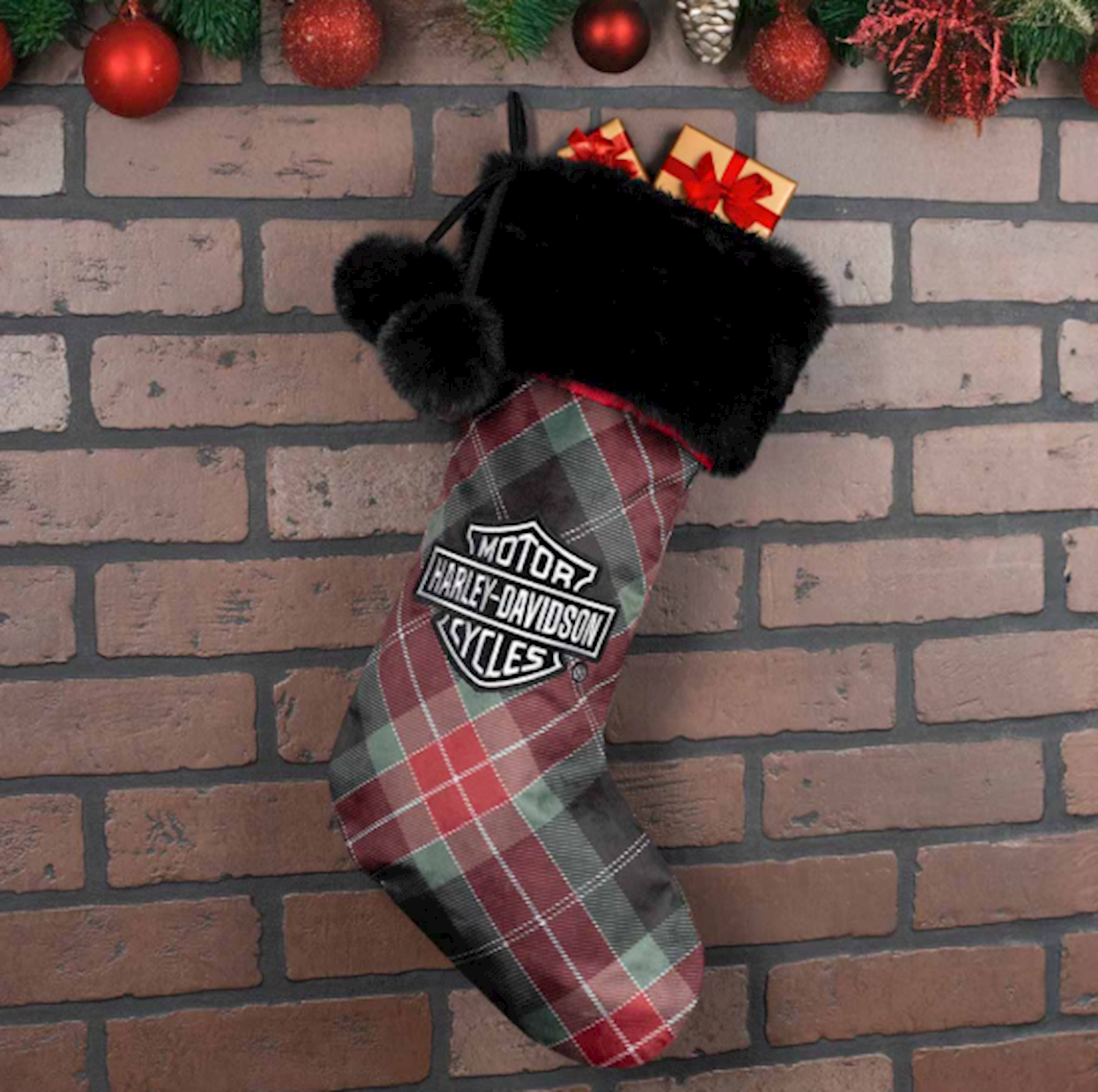 Festive holiday plaid stocking with soft, black faux fur trim and pom poms. Embroidered Bar & Shield logo. Dimensions: 12" W x 21" H / 31 x 53 cm.