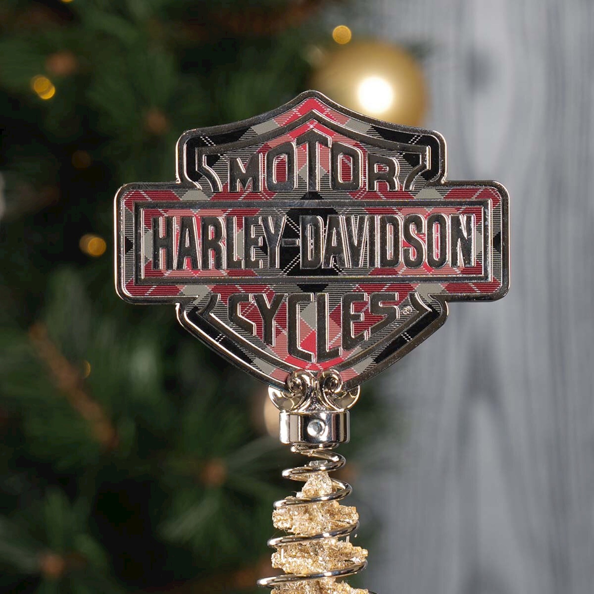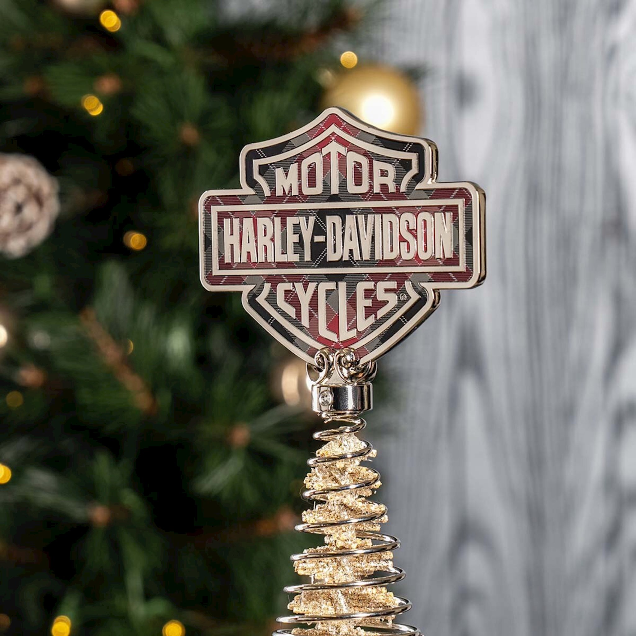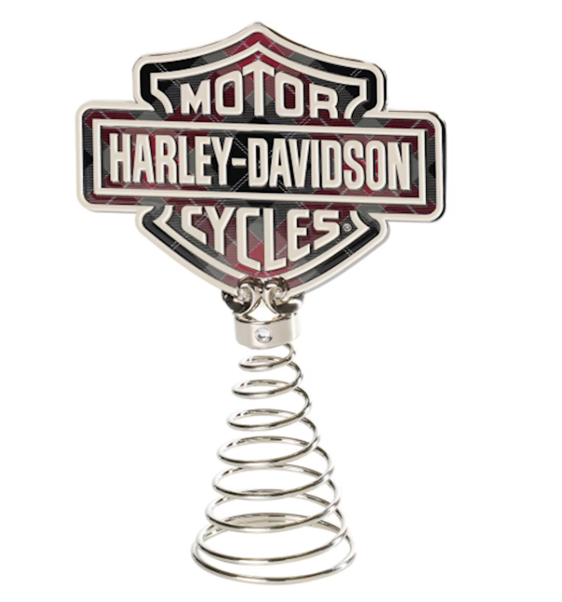 Custom shaped pewter Bar & Shield tree topper with holiday plaid enamel fill. Dimensions: 4.75” W x 7.5” H x 12 x 19 cm.