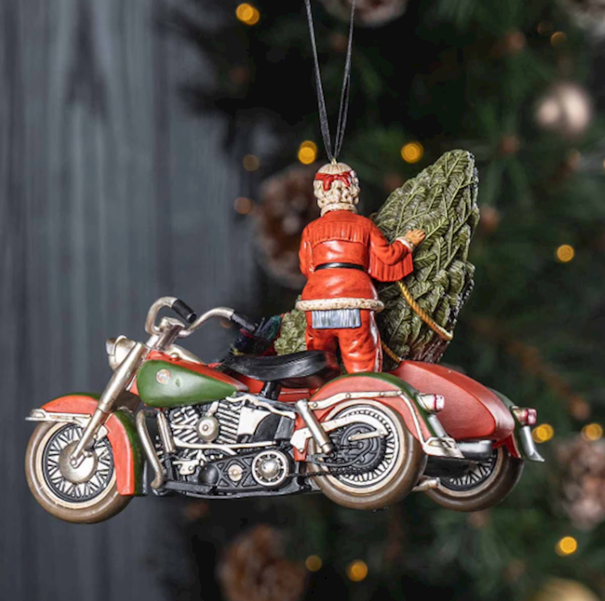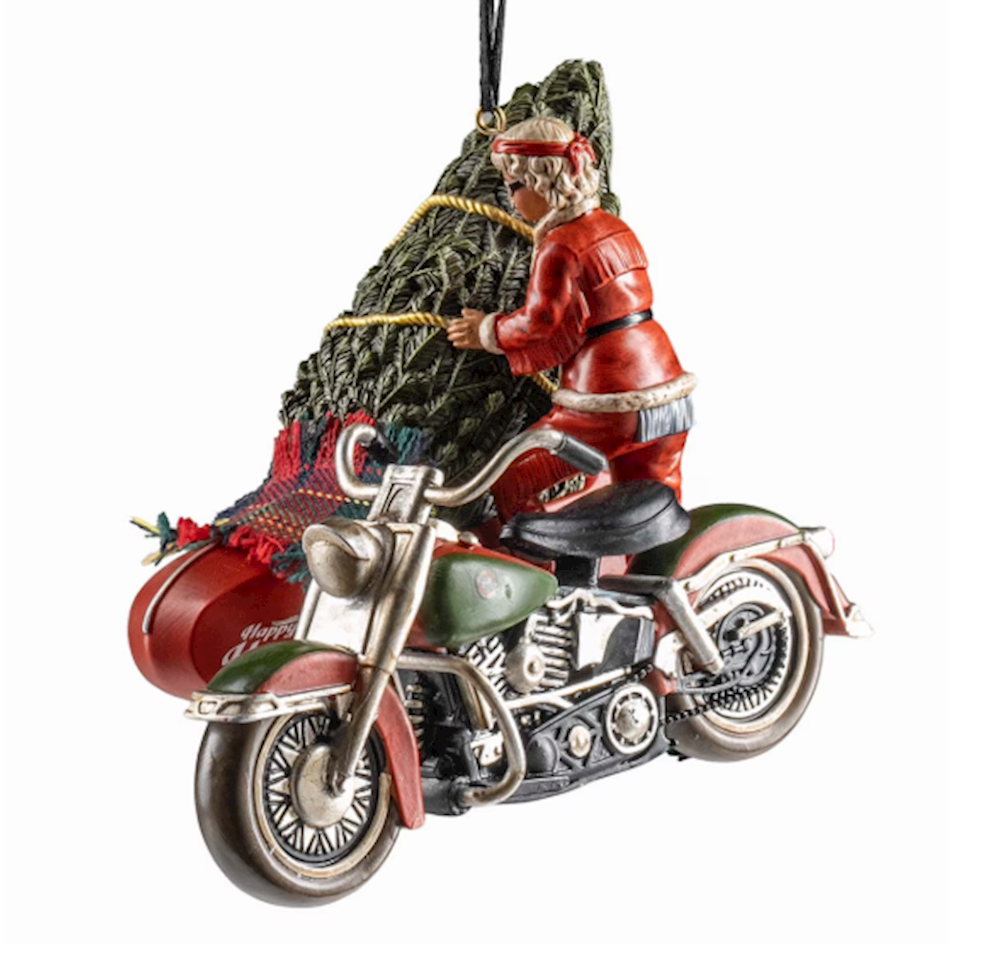 Custom sculpted and hand painted polyresin Biker Mrs. Claus ornament. Dated 2025 on license plate. Dimensions: 5” L x 4" H x 4" D / 13 x 10 x 10 cm.