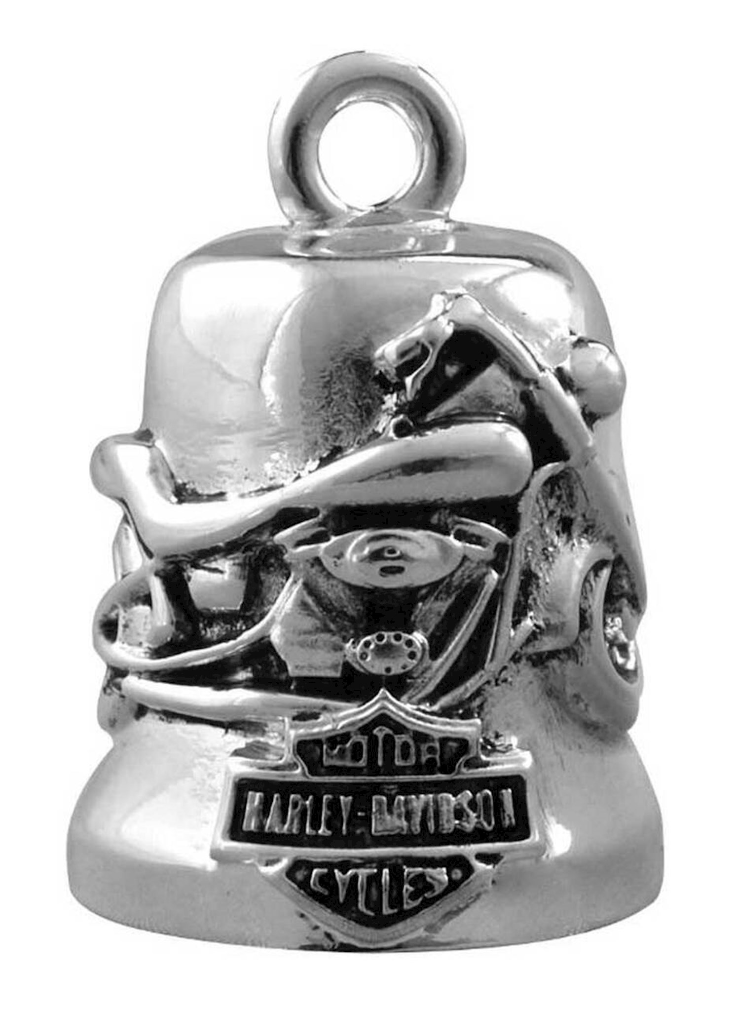 Harley-Davidson® Ride Bell Features a standout motorcycle graphic Bar & Shield logo Made of durable Zinc Includes black velvet protective pouch