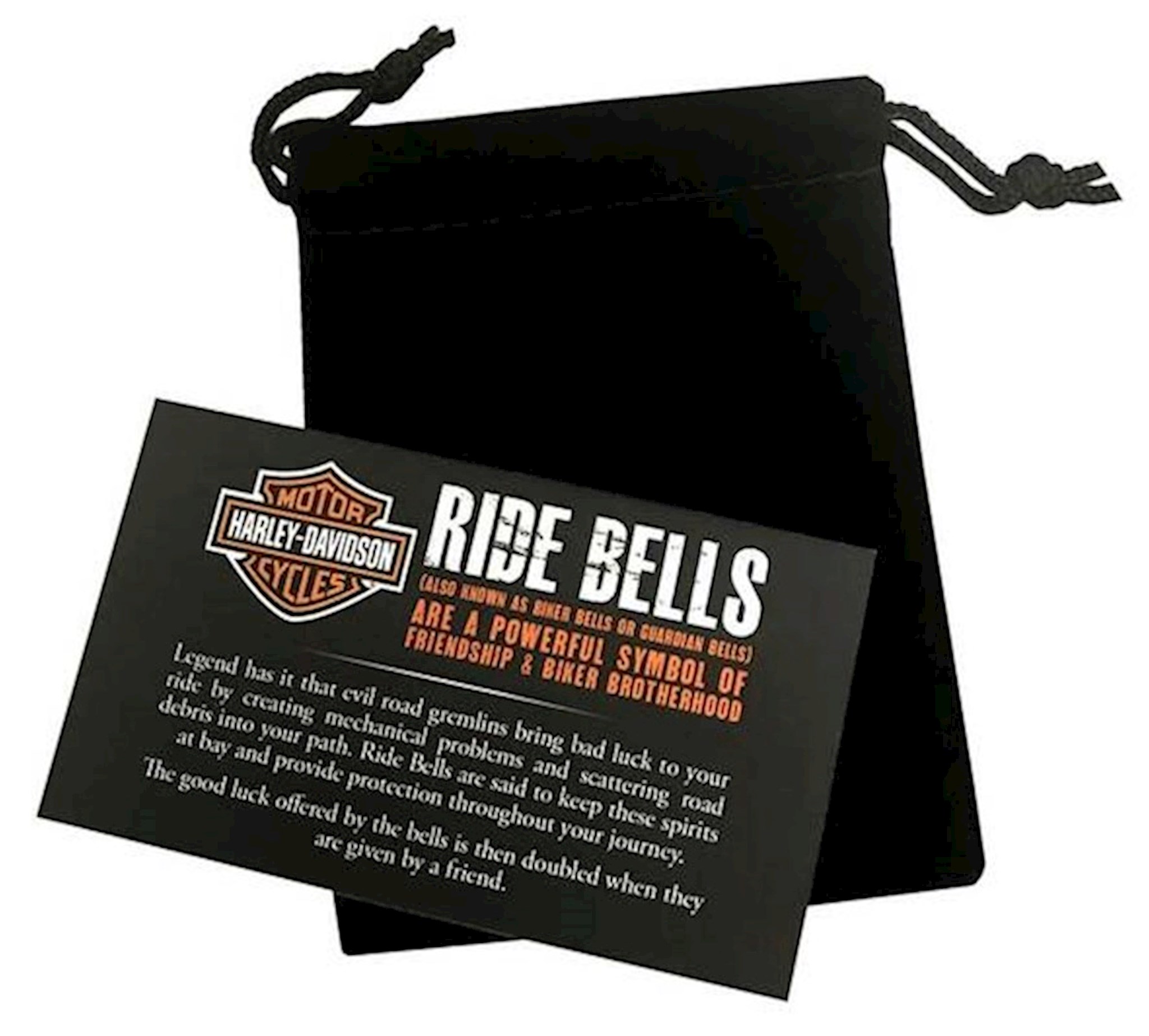 Harley-Davidson® Bar & Shield Piston Ride Bell. The bell is made out of metal. Includes ring for hanging and felt pouch with legend card.