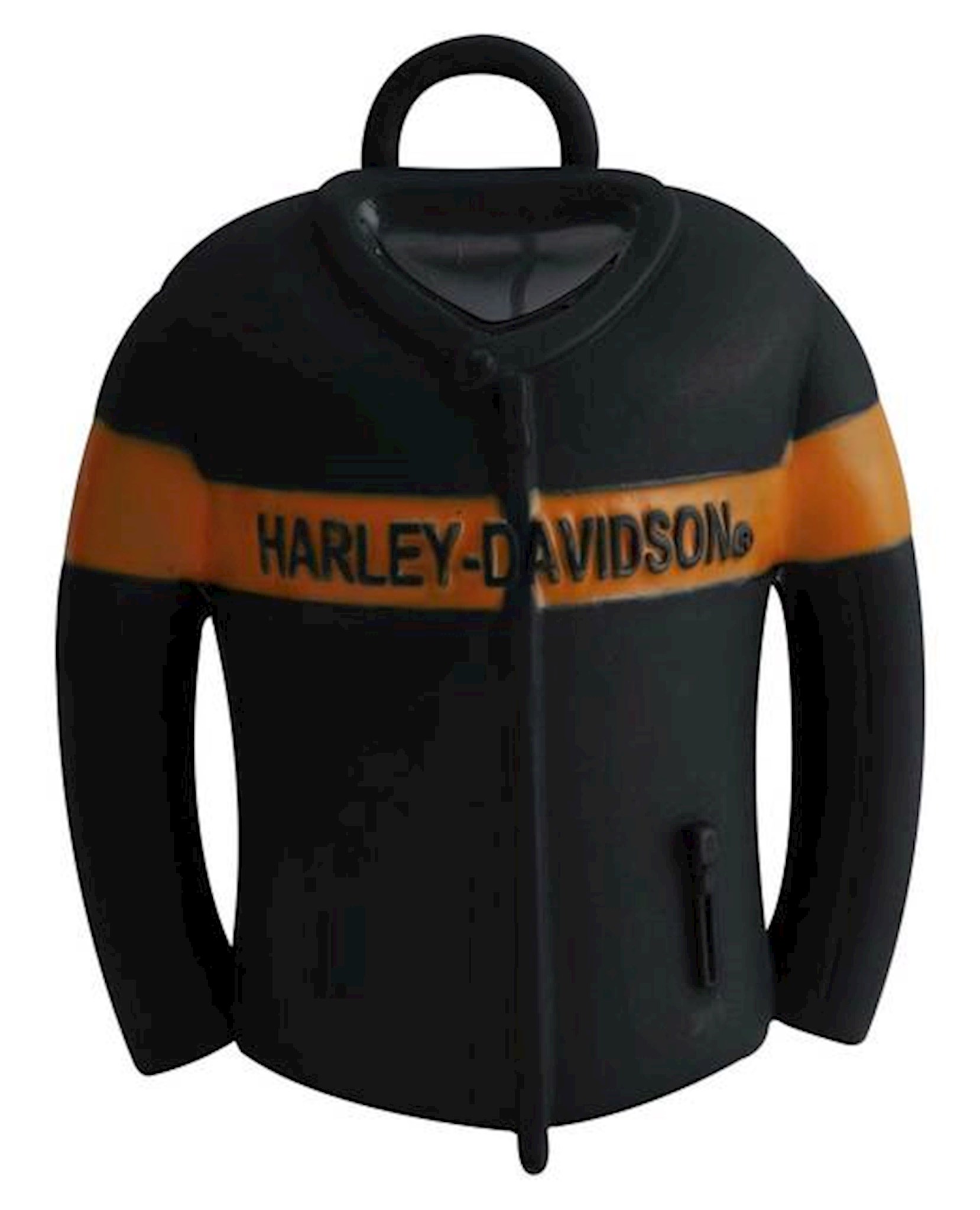arley-Davidson® Leather Jacket Ride Bell - Black & Orange, HRB114. Custom shaped H-D® motorcycle leather jacket with all of the awesome little details. Orange striped detailing, just like the real thing. Engraved Bar & Shield logo emblem on back. Made from durable sterling silver with a matte black finish. Includes ring for hanging.