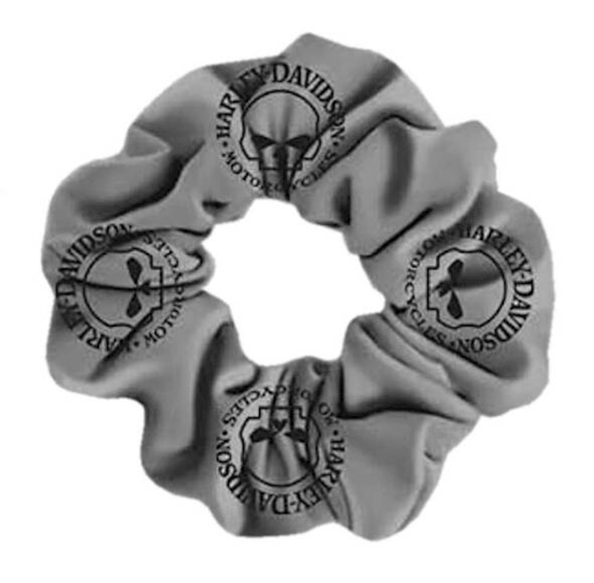 Harley-Davidson® Women's Willie G Skull Hair Scrunchie - Gray, HS119954. Famous Willie G Skull logos repeated around scrunchie. Super soft scrunchie that is easy on your hair, made from 97% cotton and 3% spandex. Pull back your windblown hair and those crazy flyaways with this adorable black hair scrunchie!