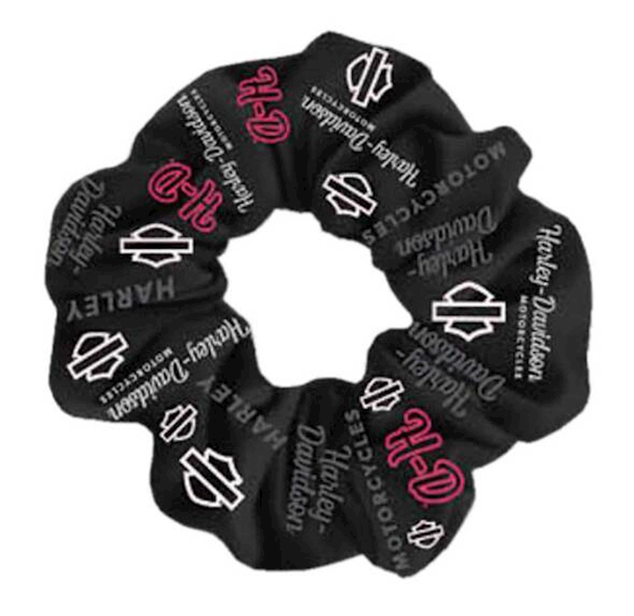 Harley-Davidson® Women's H-D Script Hair Scrunchie, HS34891. Super cute repeated H-D® design in gray, white and pink. Super soft scrunchie that is easy on your hair, made from 100% polyester. Pull back your windblown hair and those crazy flyaways with this adorable black hair scrunchie!