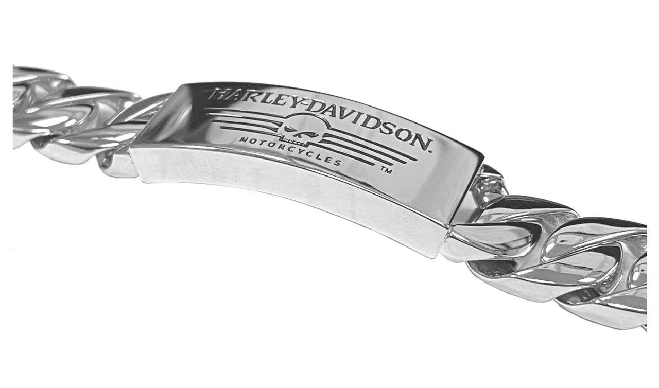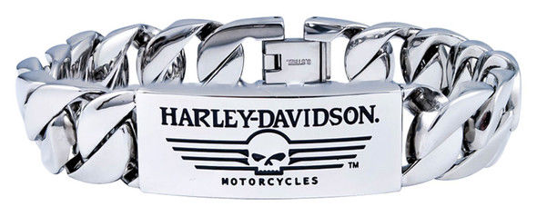 Harley-Davidson® Men's Willie G Skull Steel ID Curb Link Bracelet, HSB0140. Features a famous straight Willie G Skull ID. Unique linking chain and curved ID. Made of shiny, long lasting stainless steel. Hand crafted with the highest attention to detail and quality