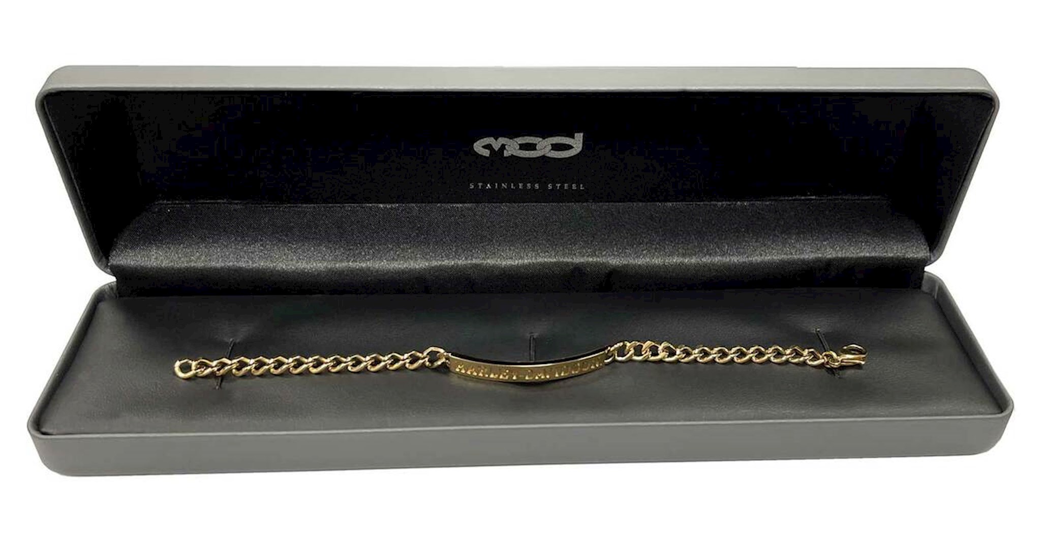 Harley-Davidson® Women's Curb Link Bar ID Bracelet - Gold, HSB0245. Beautiful curb link chain design with bold Harley-Davidson® script on bar. Constructed from high-quality, durable gold tone stainless steel. It will not rust, tarnish or fade. Secure lobster clasp. This bracelet will hold up ride after ride. Hand crafted with the highest attention to detail and quality. Timeless and will never go out of style.