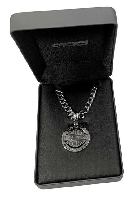 Harley-Davidson® Men's Stainless Steel Bar & Shield Circle Necklace HSN0041-22. Features the traditional Bar & Shield in black, with plain steel detailing. Constructed from high-quality Stainless Steel. Comes with a 2'' steel chain, comfortable on the neck for everyday wear. Mod Jewelry is hand crafted with the highest attention to detail and quality, utilizing the finest materials