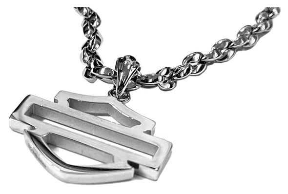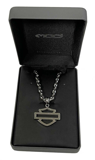 Harley-Davidson® Men's Outline B&S Logo Necklace - Silver, HSN0064. Features sculpted outline Bar & Shield logo. Made from durable silver stainless steel. Chain is 22", 24" or 26" in length, very comfortable on the neck for everyday wear. Mod Jewelry is hand crafted with the highest attention to detail and quality, utilizing the finest materials.
