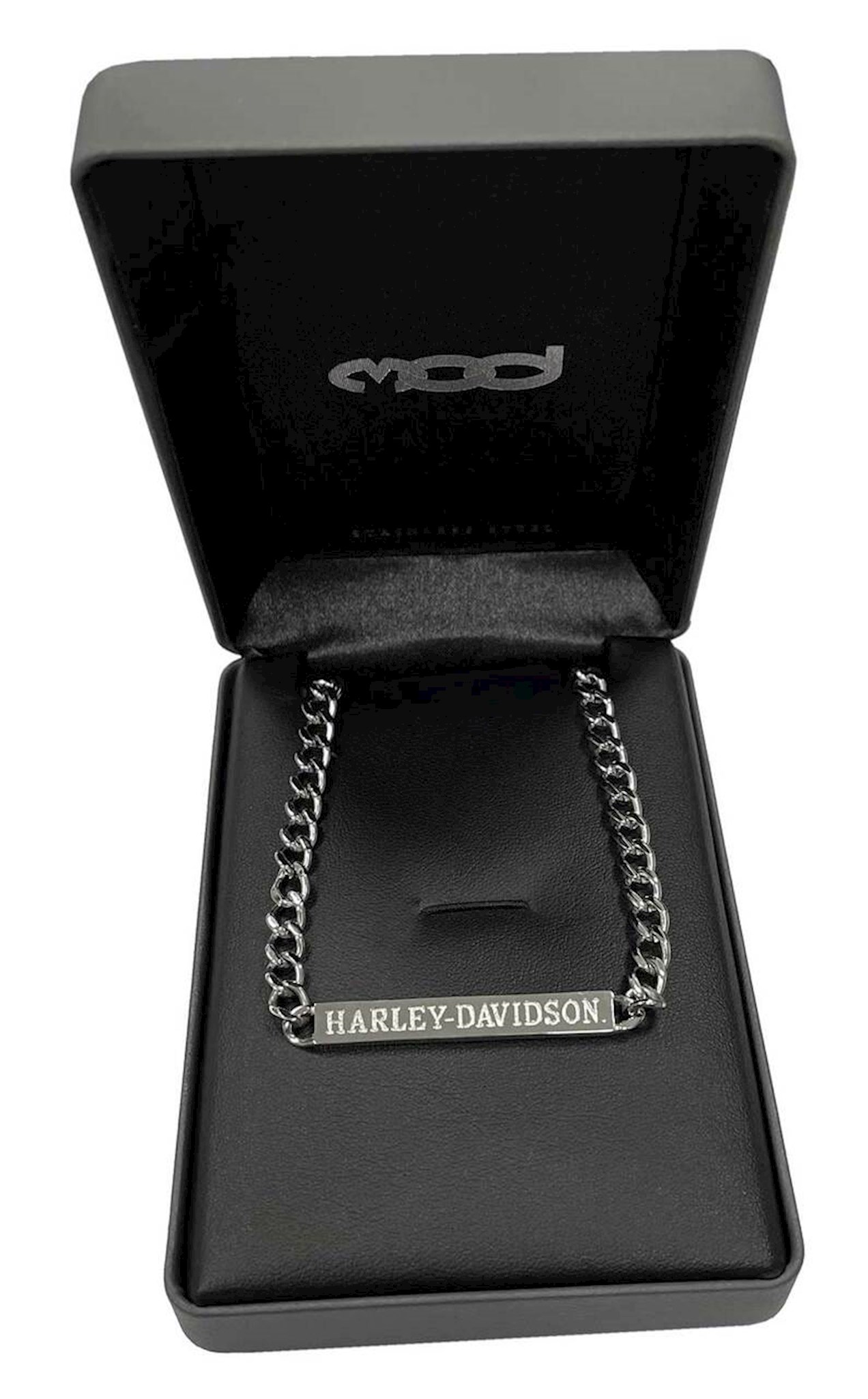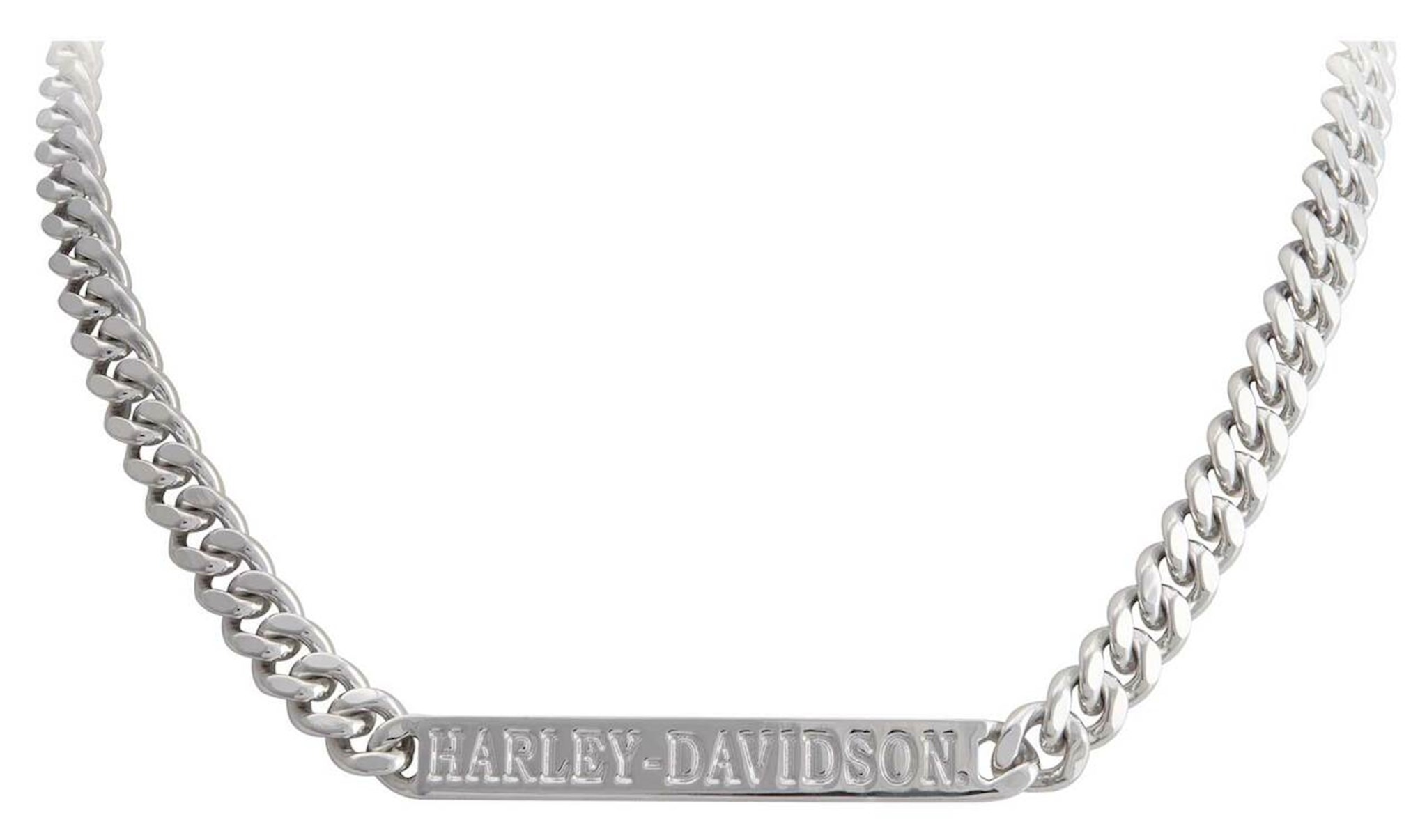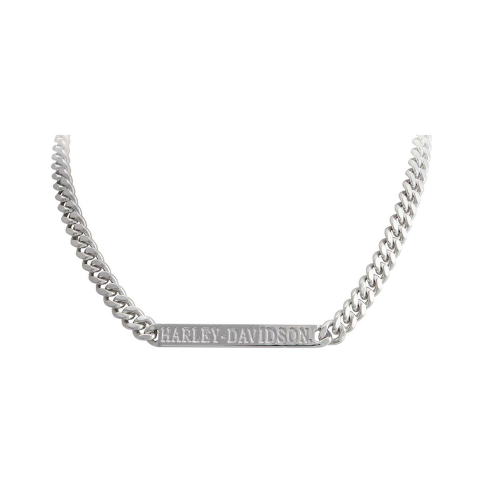 Harley-Davidson® Women's Curb Link Bar Necklace - Silver, HSN0081. Beautiful curb link chain design with bold Harley-Davidson® script on bar. Constructed from high-quality, durable stainless steel. It will not rust, tarnish or fade. Adjustable 14" - 18" chain with a secure lobster clasp closure. This bracelet will hold up ride after ride. Hand crafted with the highest attention to detail and quality. Timeless and will never go out of style.