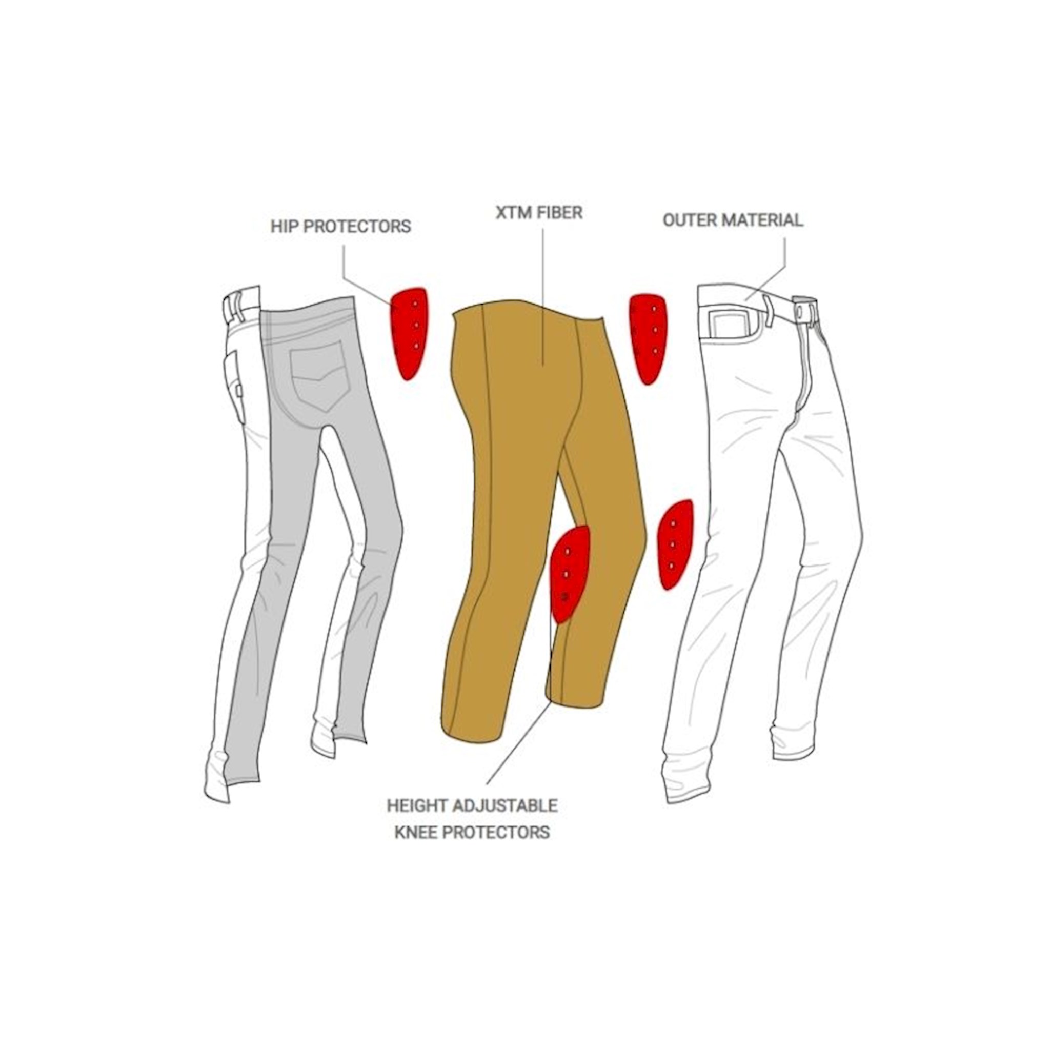 Material & Details: • XTM protective fiber: Crash side 100% aramid fiber / skin side 100% Coolmax® • Water-repellent • 10.5 oz. denim • Adjustable armor pockets built into the knee • Armor pockets built in at the hip • Straight fit • YKK zipper • CE approved by TÜV Rheinland Additional information: • Armor included.
