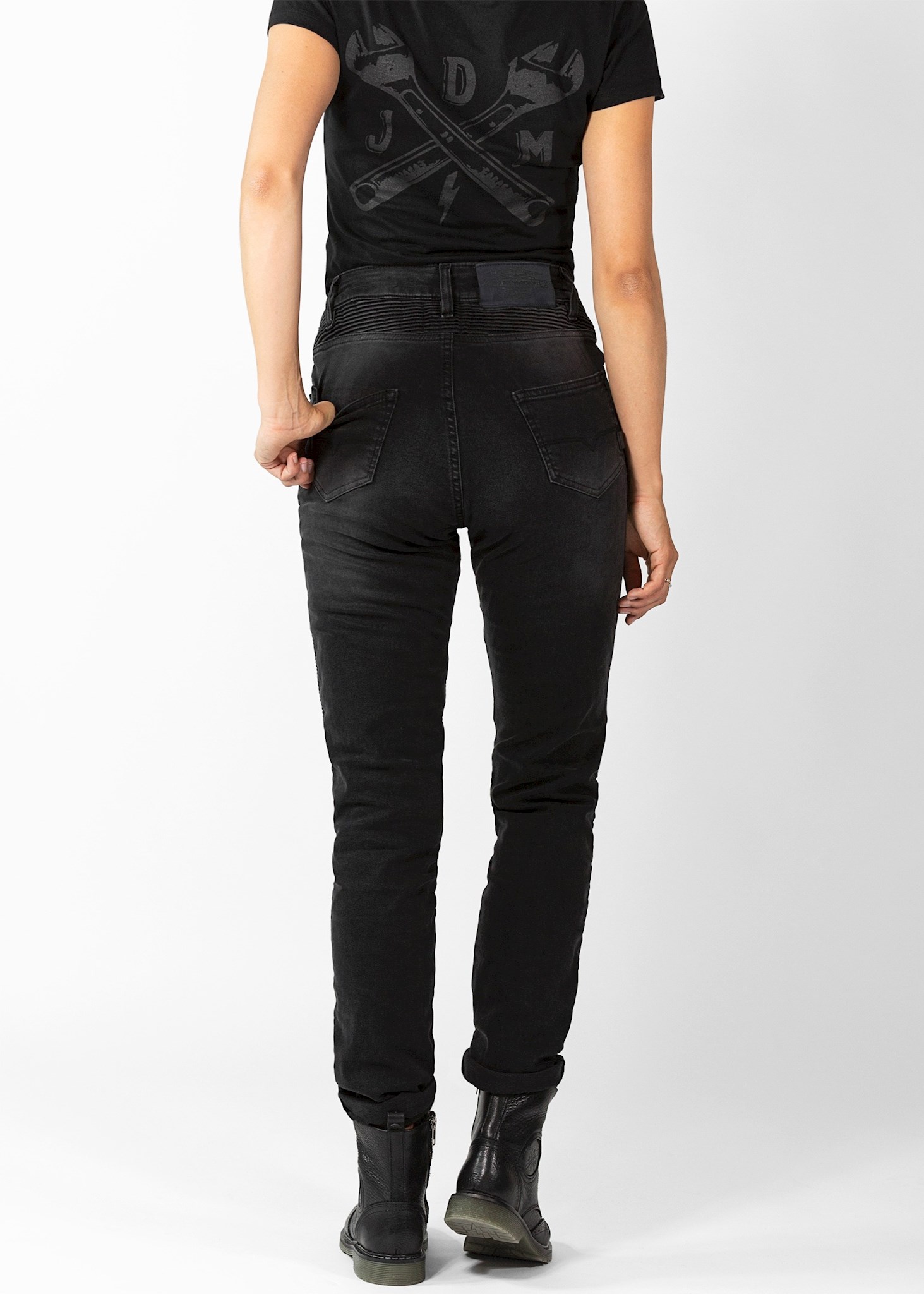 “High Waist" Betty with XTM-Fiber® Our puristic Betty Vintage Slim Jeans with XTM-Fiber® were designed specifically for riding motorcycles. The slim cut ensures these jeans fit perfectly while riding. This means that when riding in the wind at high speeds, pinching, tugging and flapping are things of the past. The special fit and the velvety feel prove that our classic 5-pocket slim cut design is not only very comfortable, but also functional. The Betty Jeans’ high functionality and appropriate protection in extreme conditions is provided by their lining, made from the worldwide innovation XTM-Fiber® (fiber technology made from DuPont™ Kevlar® / Coolmax® and Lycra®), achieving the perfect balance between protection and ideal wearer comfort. Thin, extremely flexible, water-repellent, yet provide the wearer with optimal protection in the event of extreme conditions and crashes on every ride, whether in the city or on long trips.