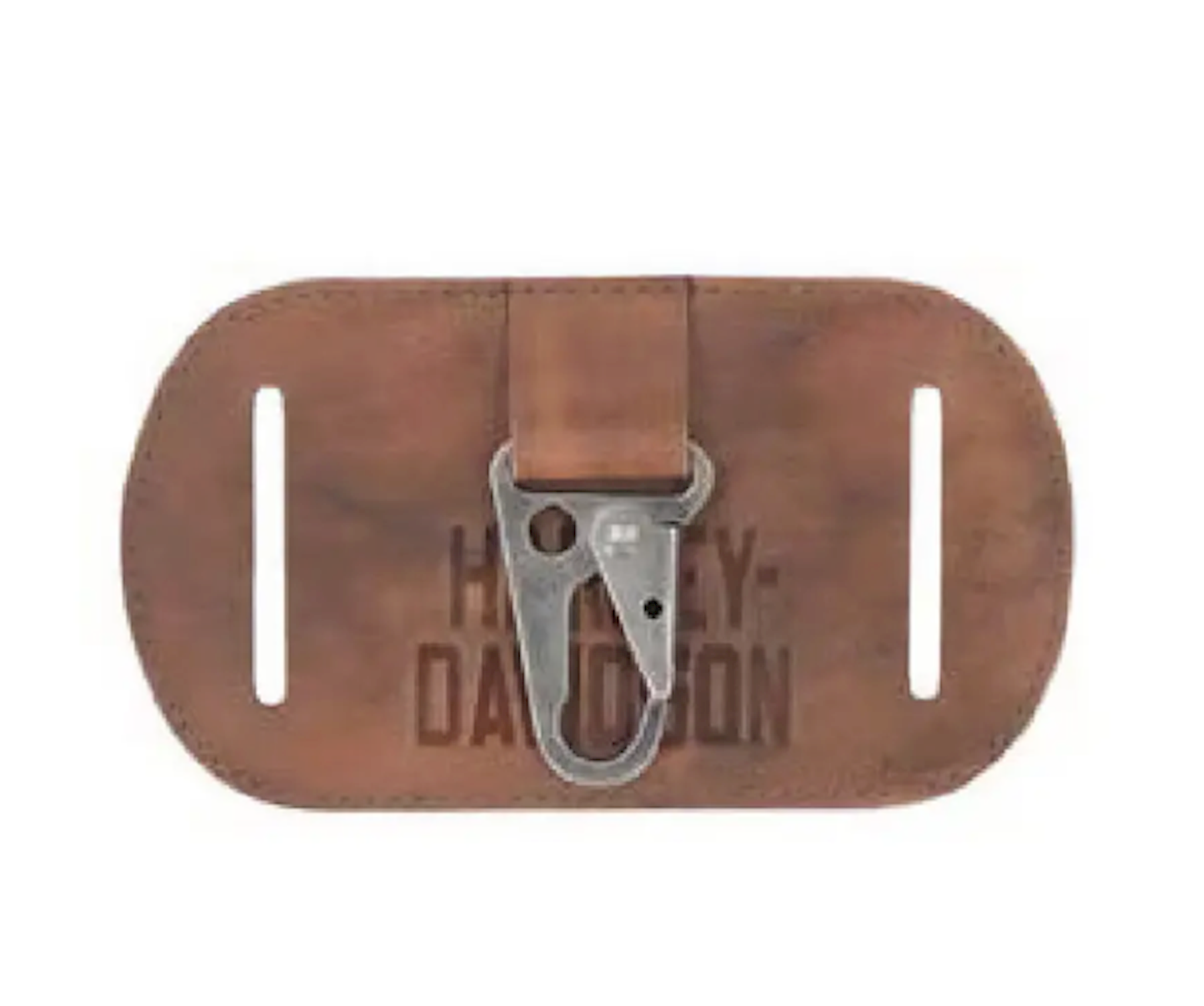 Size: 5 3/8 x 3" Antique nickel finish. Genuine leather. Emboss logo. Key clip. 40 mm belt attach die cut.