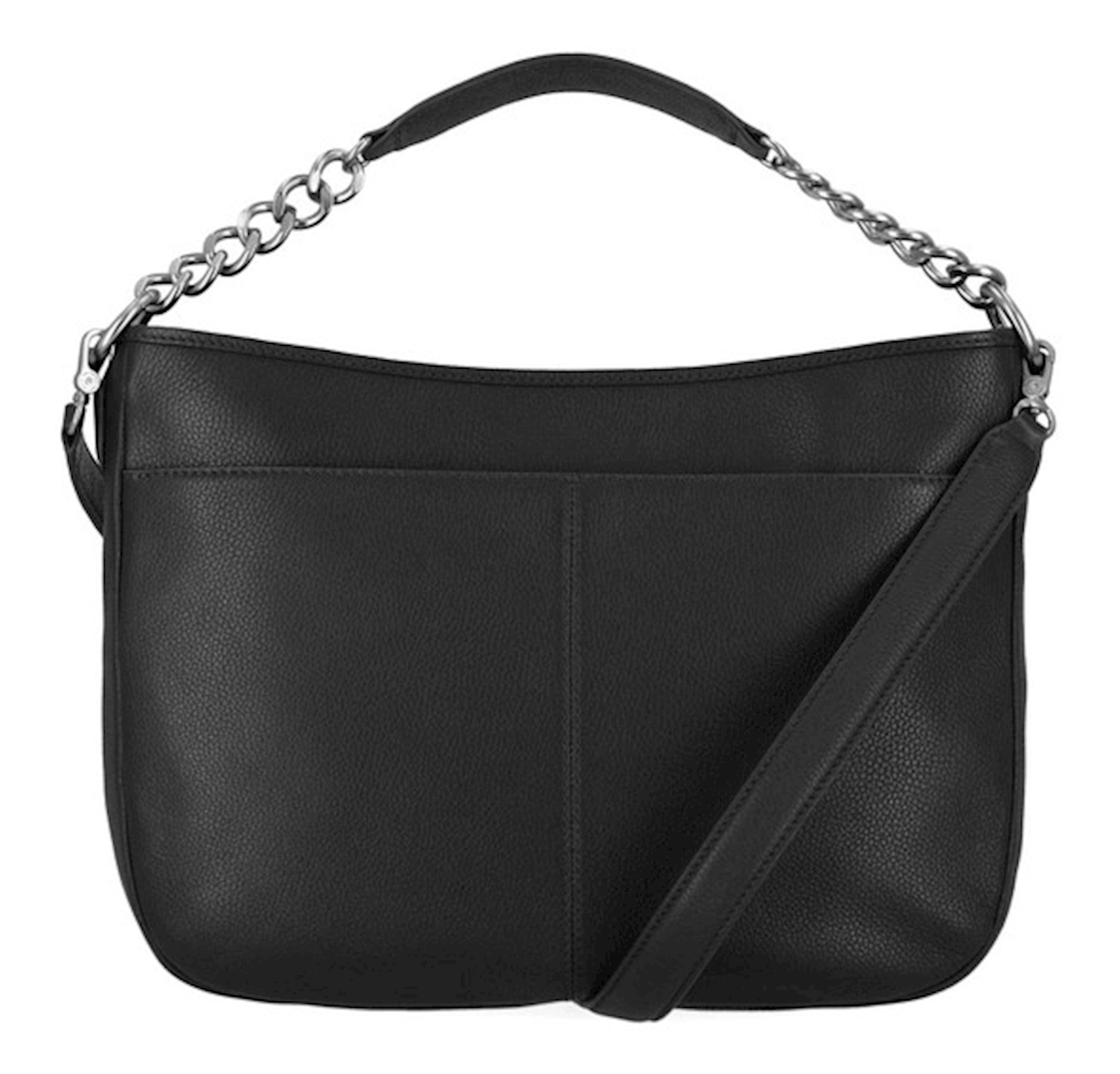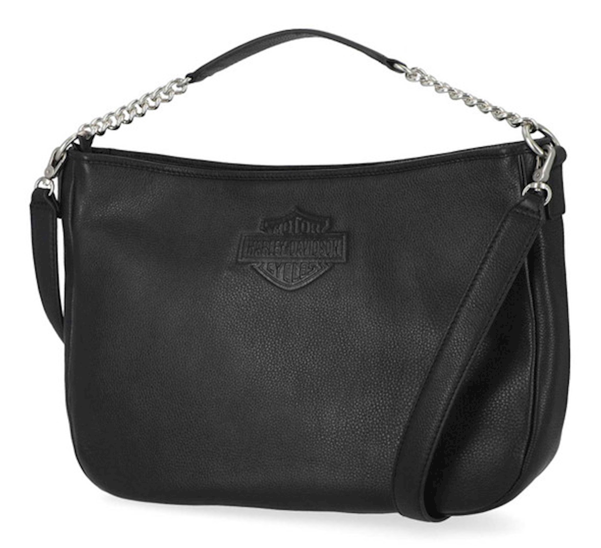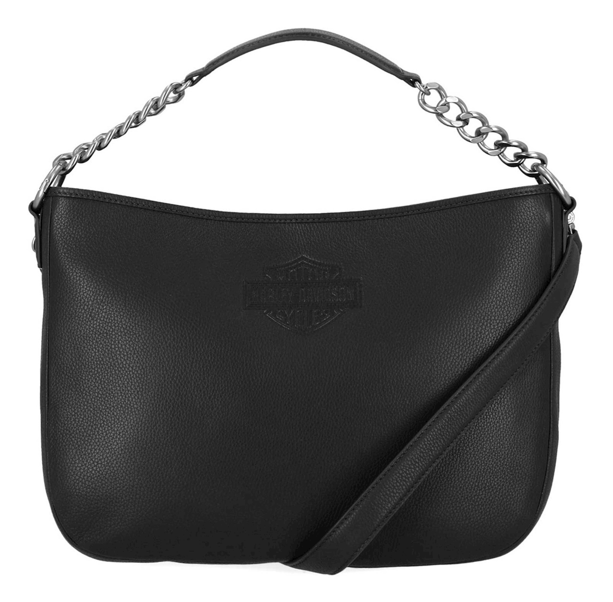 Harley-Davidson® Women's Chain Hobo Purse - Black, MHW017/08. Matte nickel finishes. Made from Genuine pebble leather. Top zipper entry. Interior back zipper pocket. Interior slip pocket. Detachable shoulder chain strap. Size: 14" x 11" x 6".