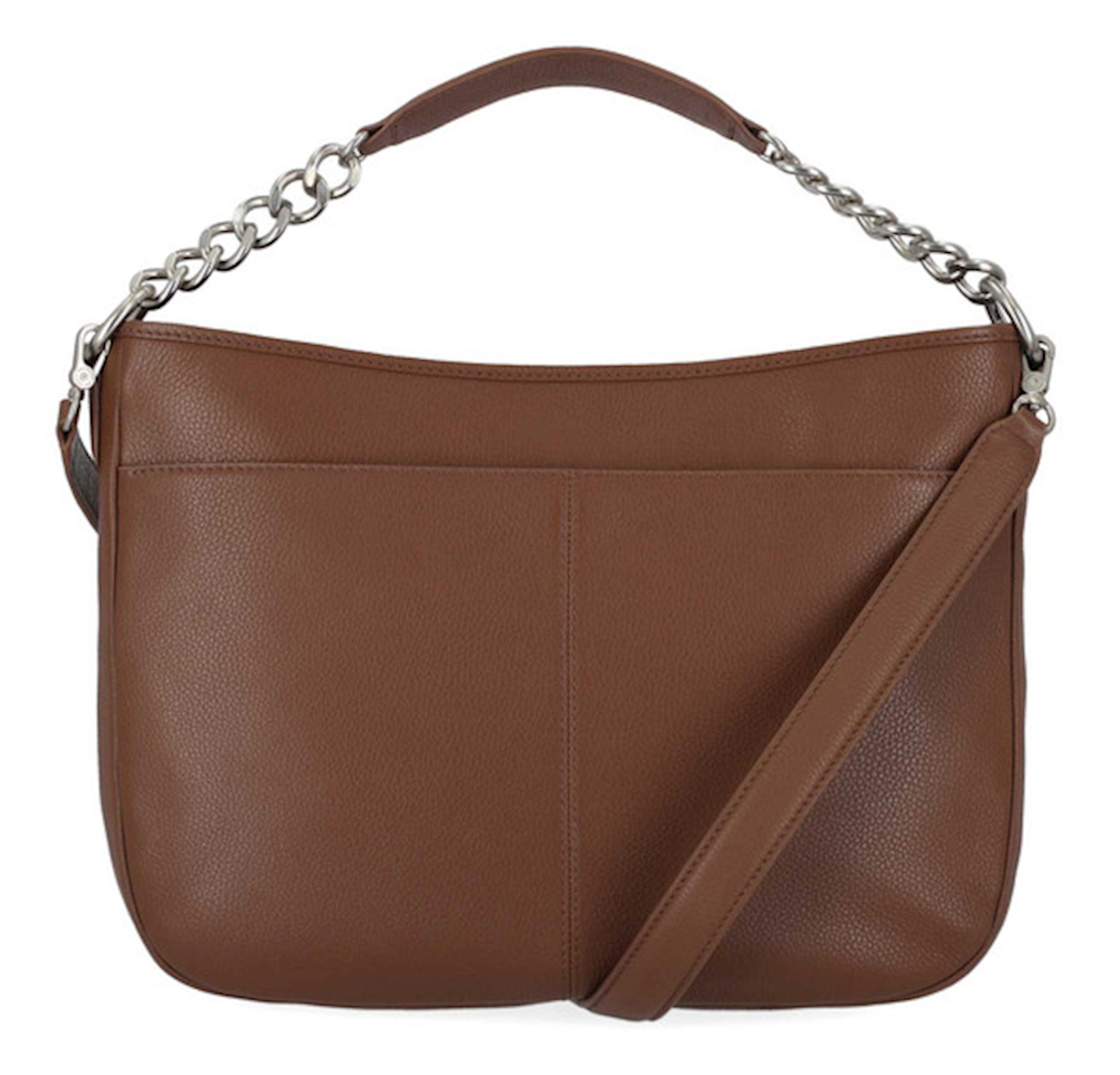 Constructed from Genuine pebble leather. Top zipper entry. Matte Nickel Finishes. Detachable shoulder chain strap. Cognac Brown.