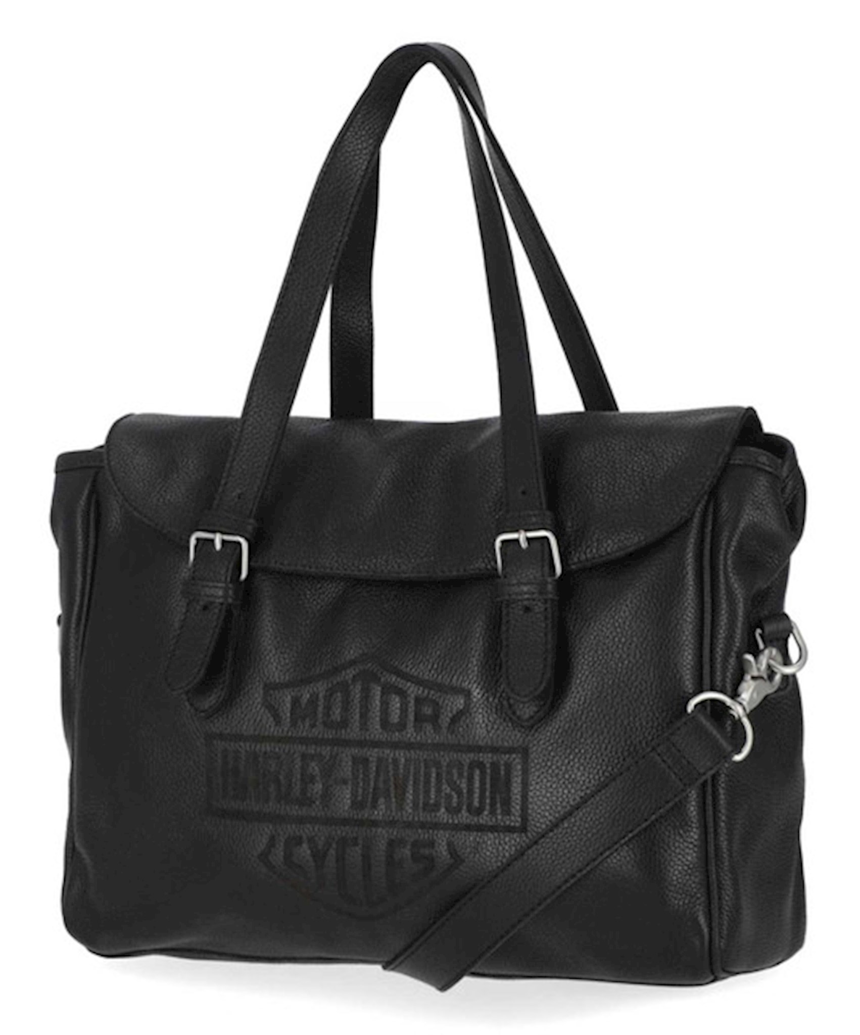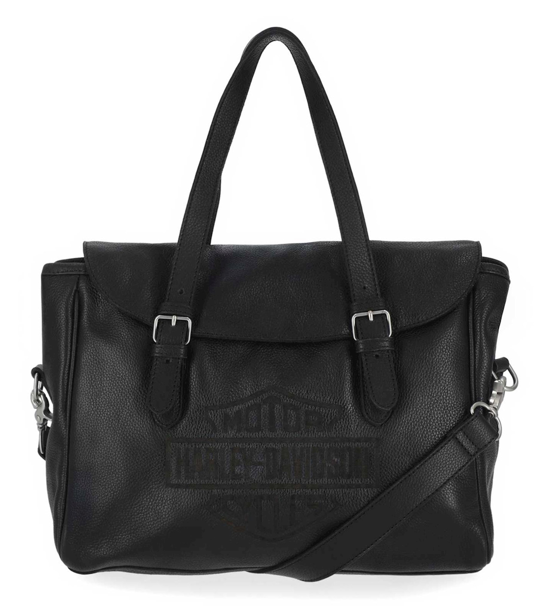 Harley-Davidson® Women's Tote Bag - Black, MHW157/08. Matte nickel finish. Made from genuine leather. Iconic Bar & shield embossed logo on front. Front flap with magnetic snap closure. Interior front slip pocket. Interior back zipper pocket. Detachable and adjustable shoulder straps. Size: 12" x 9" x 3.5".