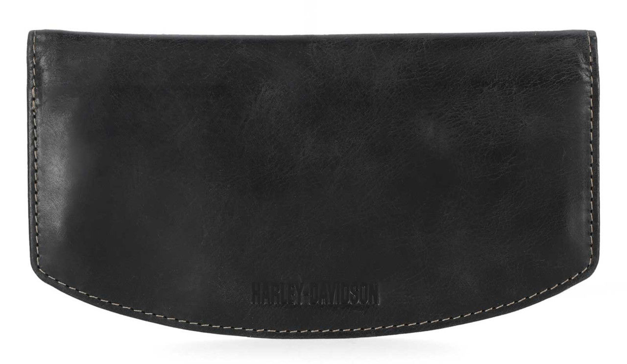 Harley-Davidson® Men's Smooth Grain Snap Flap Pocket Long Biker Wallet - Black, MWM011/08. The perfect wallet for any biker; simple, durable, stylish. Antique nickel finish, on black genuine leather. 4 card slots, ID window, large slip pocket. Two snaps closure, and RFID protection. Comes with removable leather leash. Size 6.8" x 3.58"