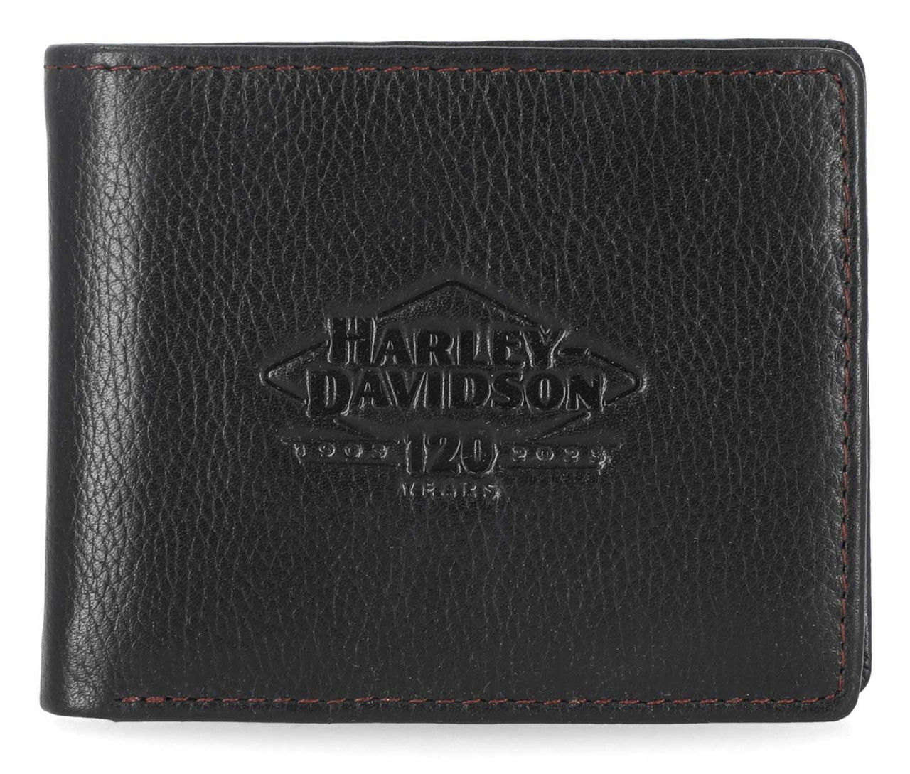Harley-Davidson® Men's 120th Anniversary Vintage Pebble Passcase Wallet - Black, MWM018/08. Celebrate the 120th anniversary of an American icon in style. Made of high-quality black vintage pebble Genuine leather. The best materials make up the long-lasting wallets. Features an embossed 120th anniversary logo on front. Interior features: 9 credit card slots, ID window, cash slot and removable card holder. RFID Protection, blocks hackers from reading your information. Size: 4.25" x 3.5". Get them while they last, this is a LIMITED TIME offering.