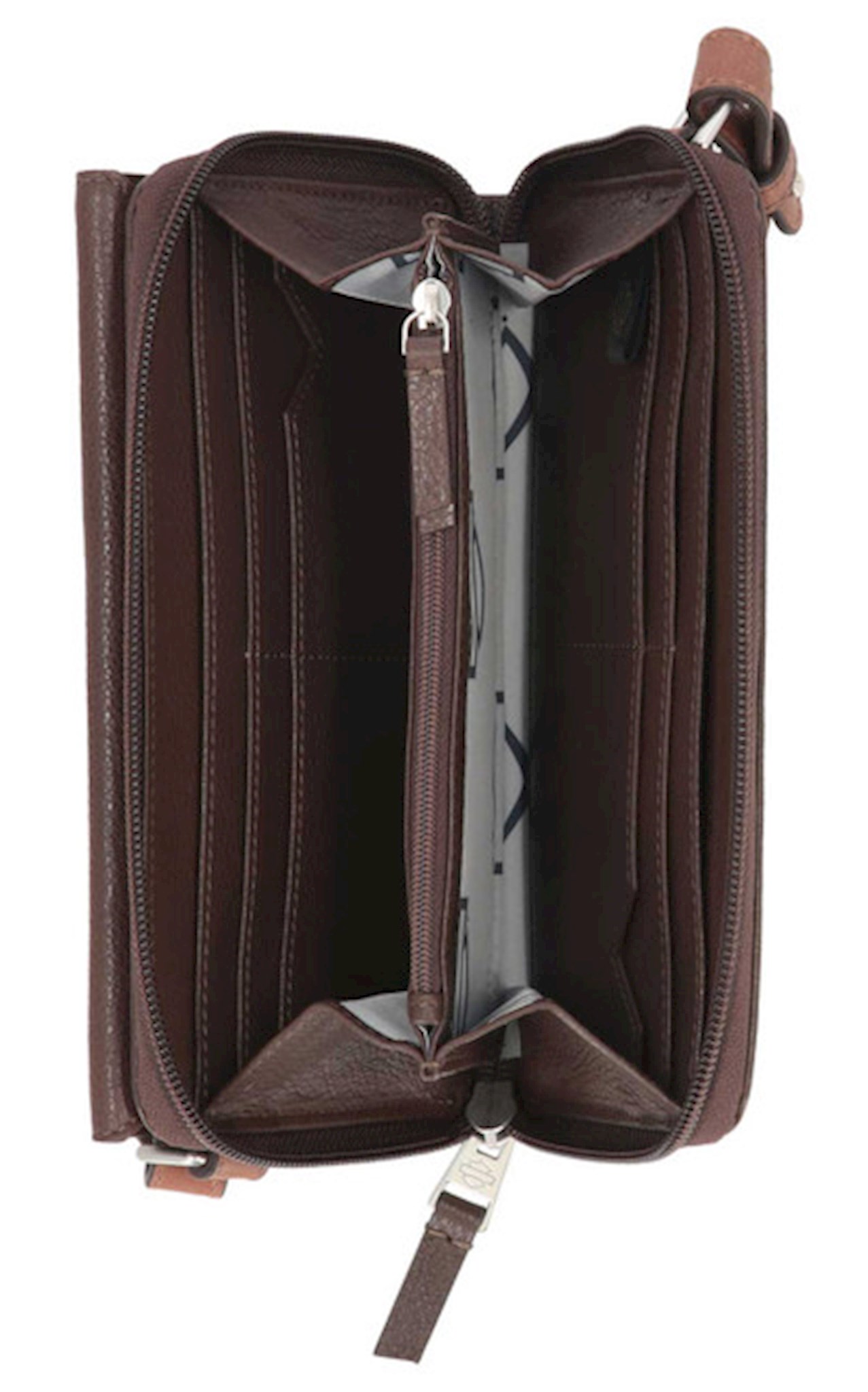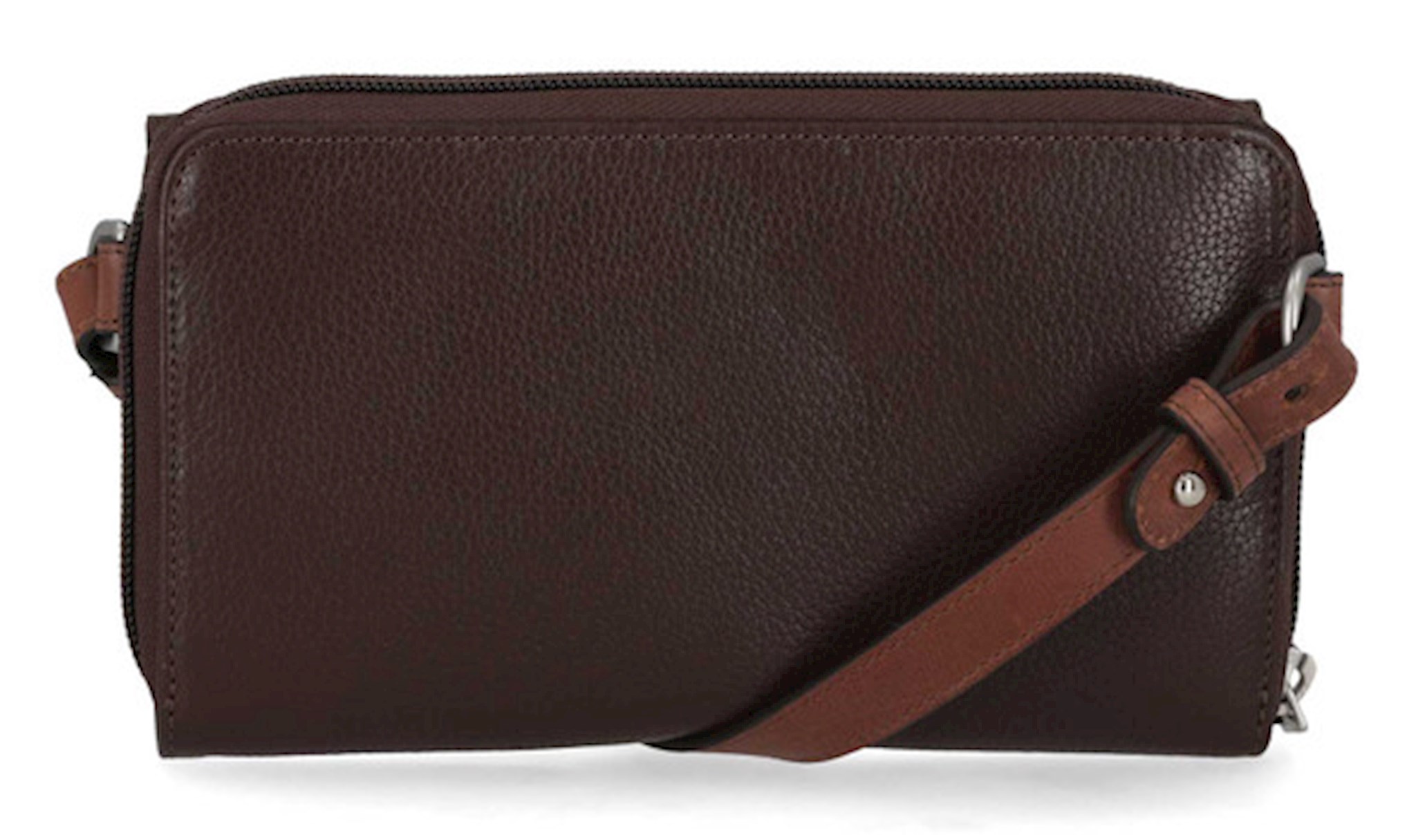 Harley-Davidson® Women's Buckle Zip Around Wallet, Brown MWW056/01. Crafted for both style and security, this genuine leather zip around wallet features sleek matte nickel finish and faux buckle detailing on front. Iconic metal Bar & Shield logo on front. Secure zipper closure. Interior features credit card slots and zipper pocket. Includes a detachable and adjustable shoulder strap. Size: 7.5" x 4.25".