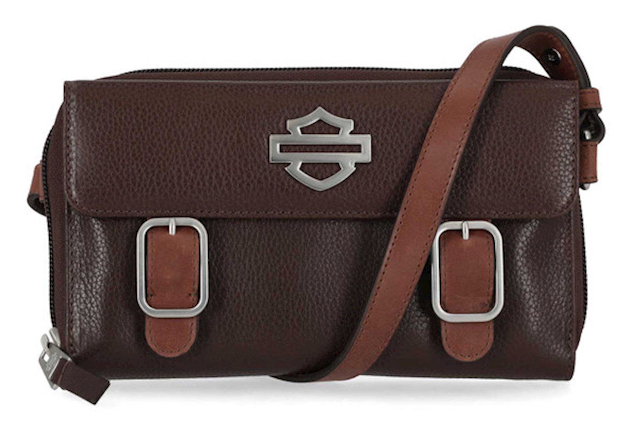 Harley-Davidson® Women's Buckle Zip Around Wallet, Brown MWW056/01. Crafted for both style and security, this genuine leather zip around wallet features sleek matte nickel finish and faux buckle detailing on front. Iconic metal Bar & Shield logo on front. Secure zipper closure. Interior features credit card slots and zipper pocket. Includes a detachable and adjustable shoulder strap. Size: 7.5" x 4.25".