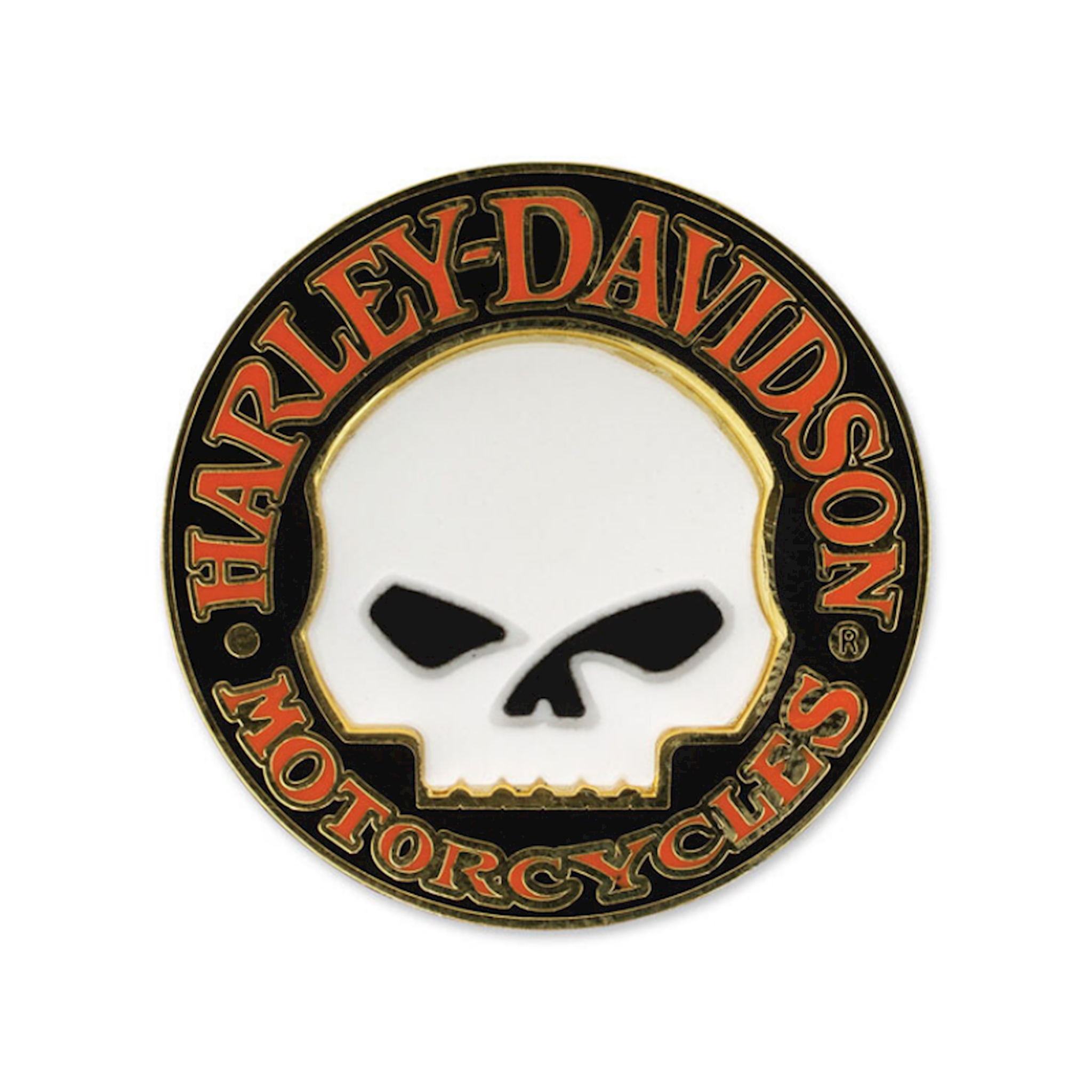 Iconic Willie G Skull logo surrounded by bold Harley-Davidson® script. Hard enamel fill and PVC. Cloisonne Design. Heavy Relief. Size: 1.25" W x 1.25" H.