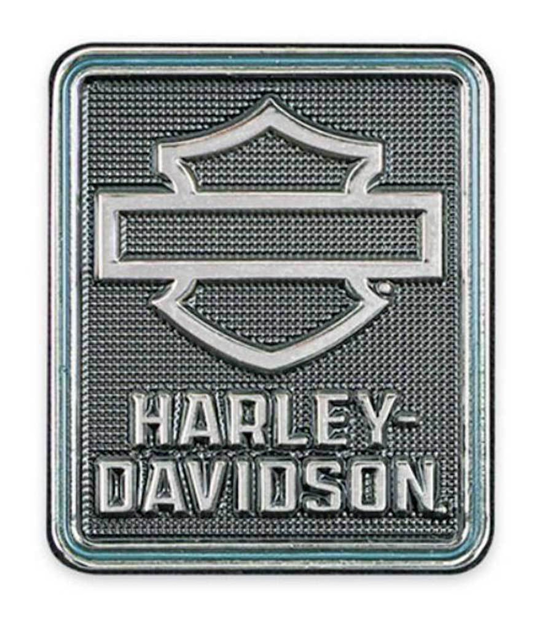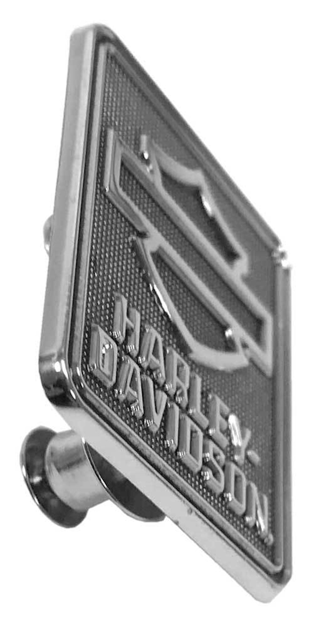 Harley-Davidson® Insignia B&S Pin, P344302. Custom 2D Die Cast Bar & Shield logo with bold Harley-Davidson® script. Finished with soft enamel fill. Polished silver effect finish. Heavy relief two flat head pin backs. Size: 1" W x 1.25" H.