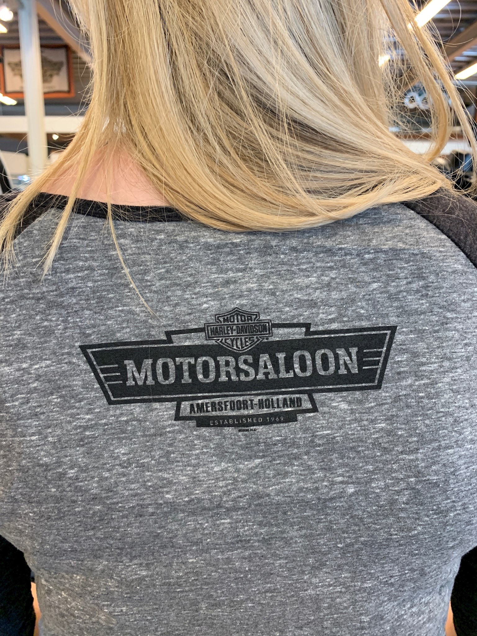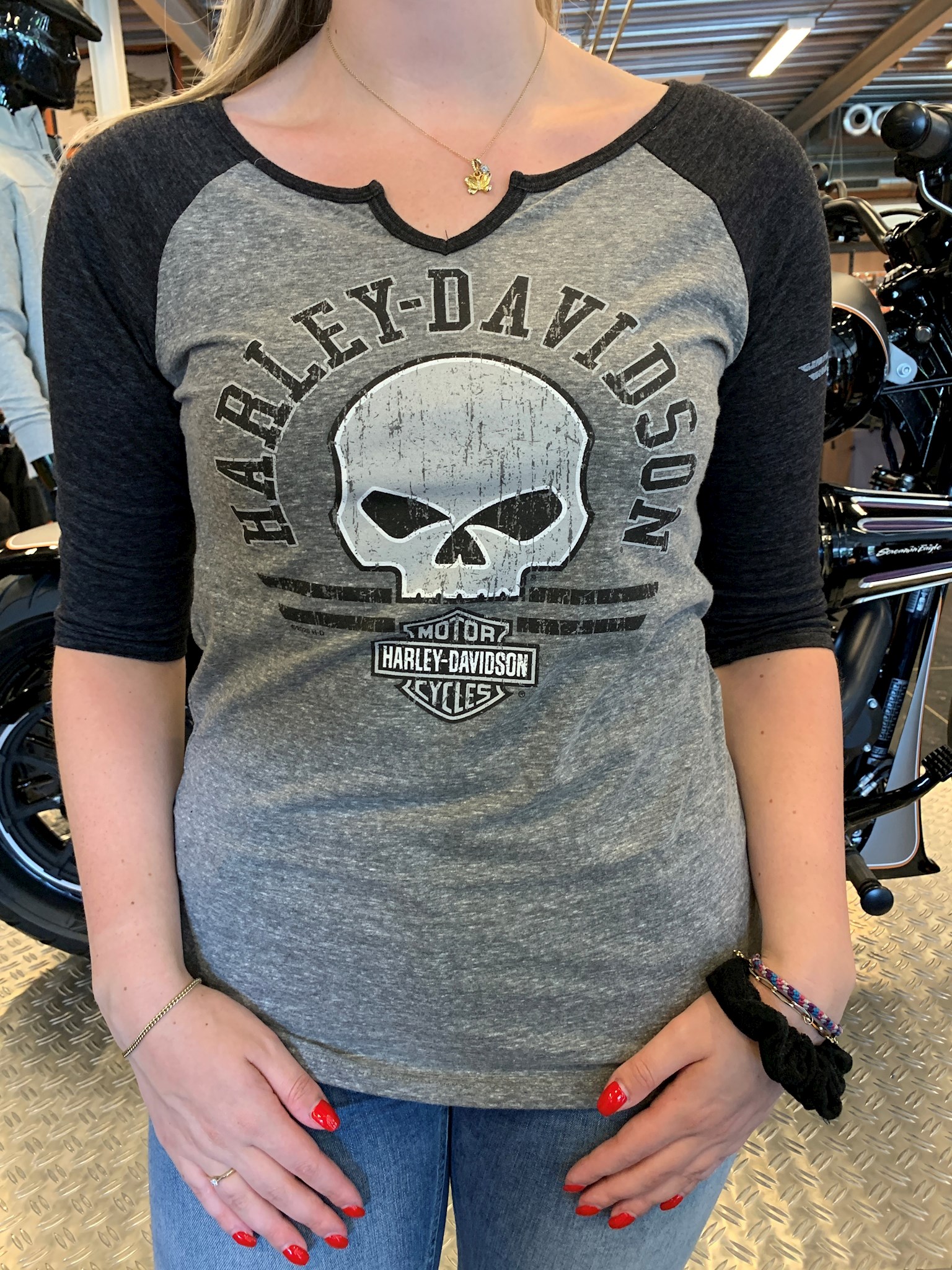 Harley-Davidson® Women's Round Stripes 3/4 Sleeve V-Neck. Grey/Black two-tone 3/4 sleeve features the Willie-G skull on the front with Harley-Davidson surrounding the skull. Winged B&S is directly below the skull. Wing B&S outline on the left sleeve. Made from imported materials. Dealer back print. Round Stripes. Grey/Black Two-Tone 3/4 Sleeve. Willie G Skull. B&S Outline - Left Sleeve. V-Neck. Classic Shaped. Materials - 50% Polyester, 37% Cotton, 13% Rayon. PG Gothic Winds Back Print.