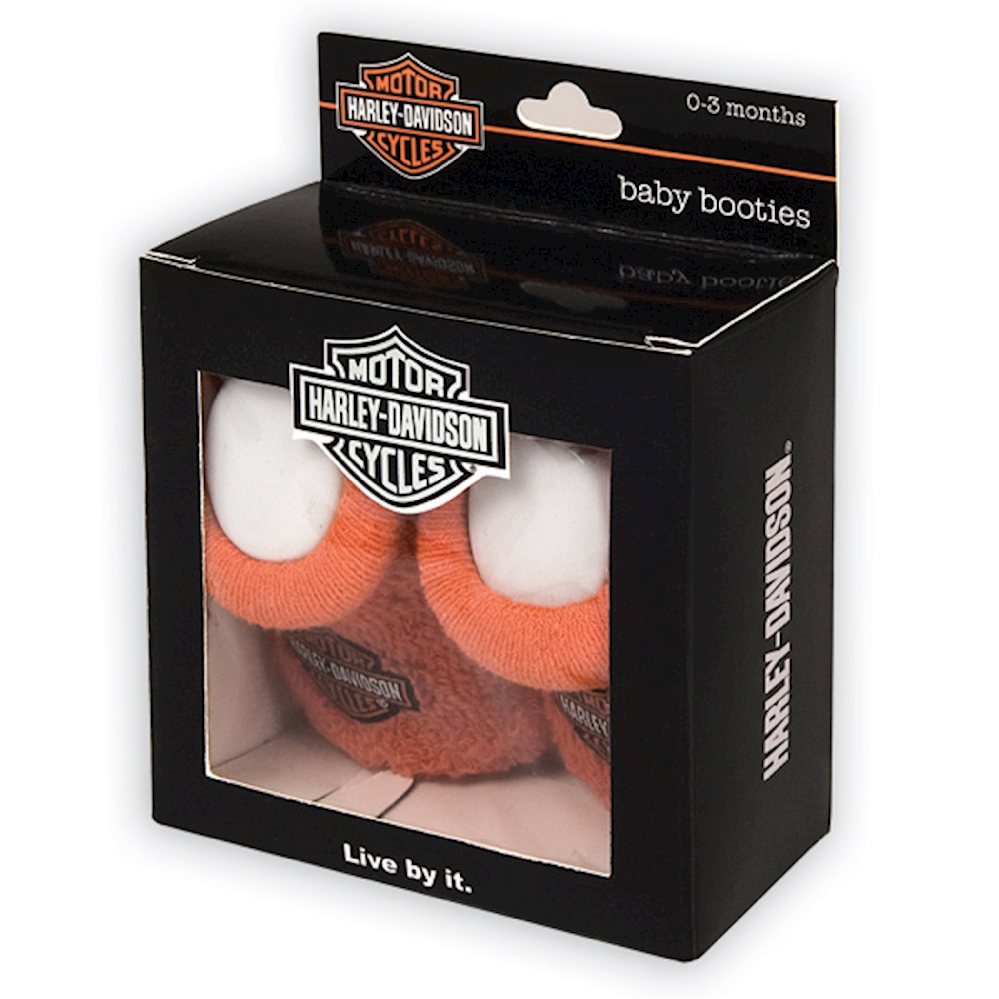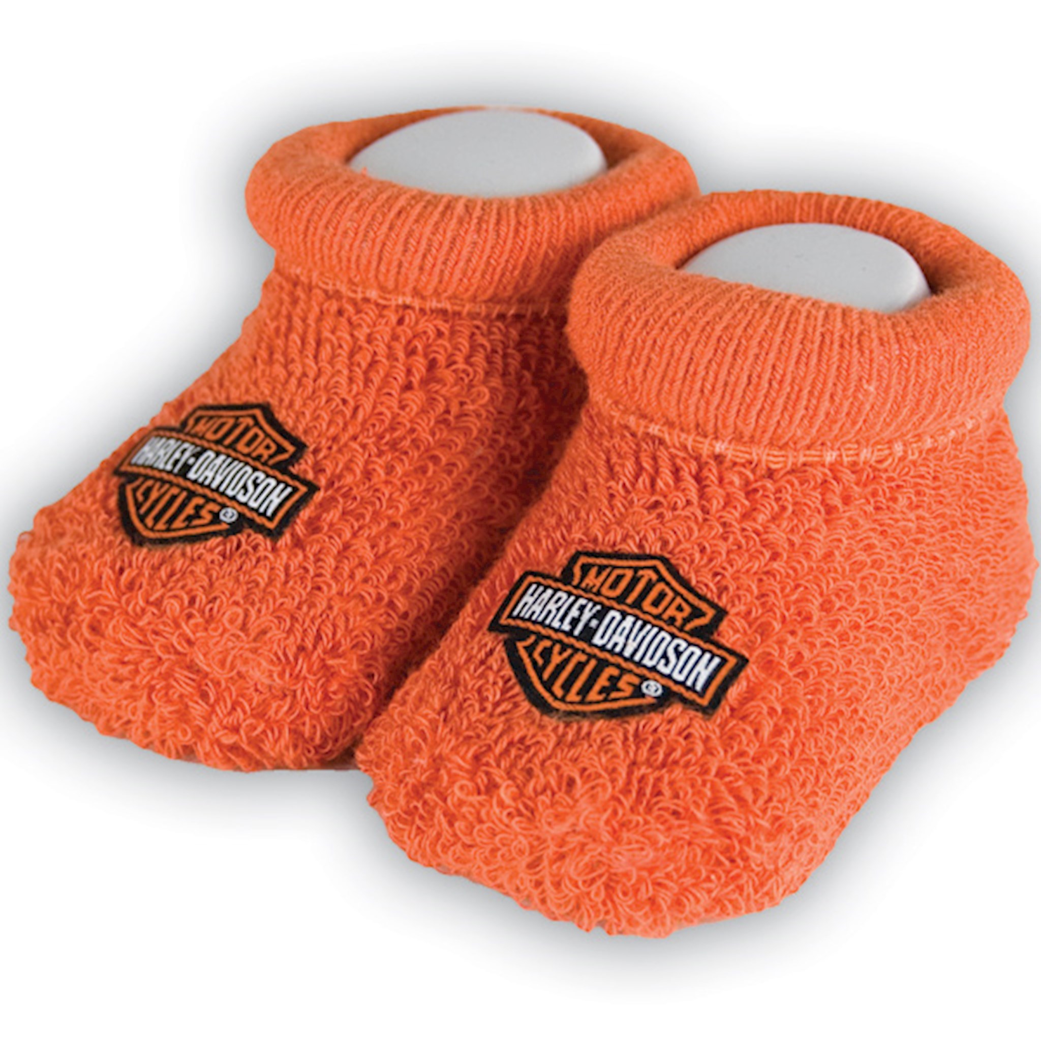 Harley-Davidson® Baby Boy's Boxed Booties, S9LUL22HD. Your little guy will certainly get noticed with these brightly colored Harley® orange booties. A classic embroidered Bar & Shield® logo adorns each bootie. Made with an 80/15/5% cotton, nylon, spandex blend, these booties have just the right stretch for getting them over and onto squiggling and wiggling little feet. They are perfect for your little Harley® guy.
