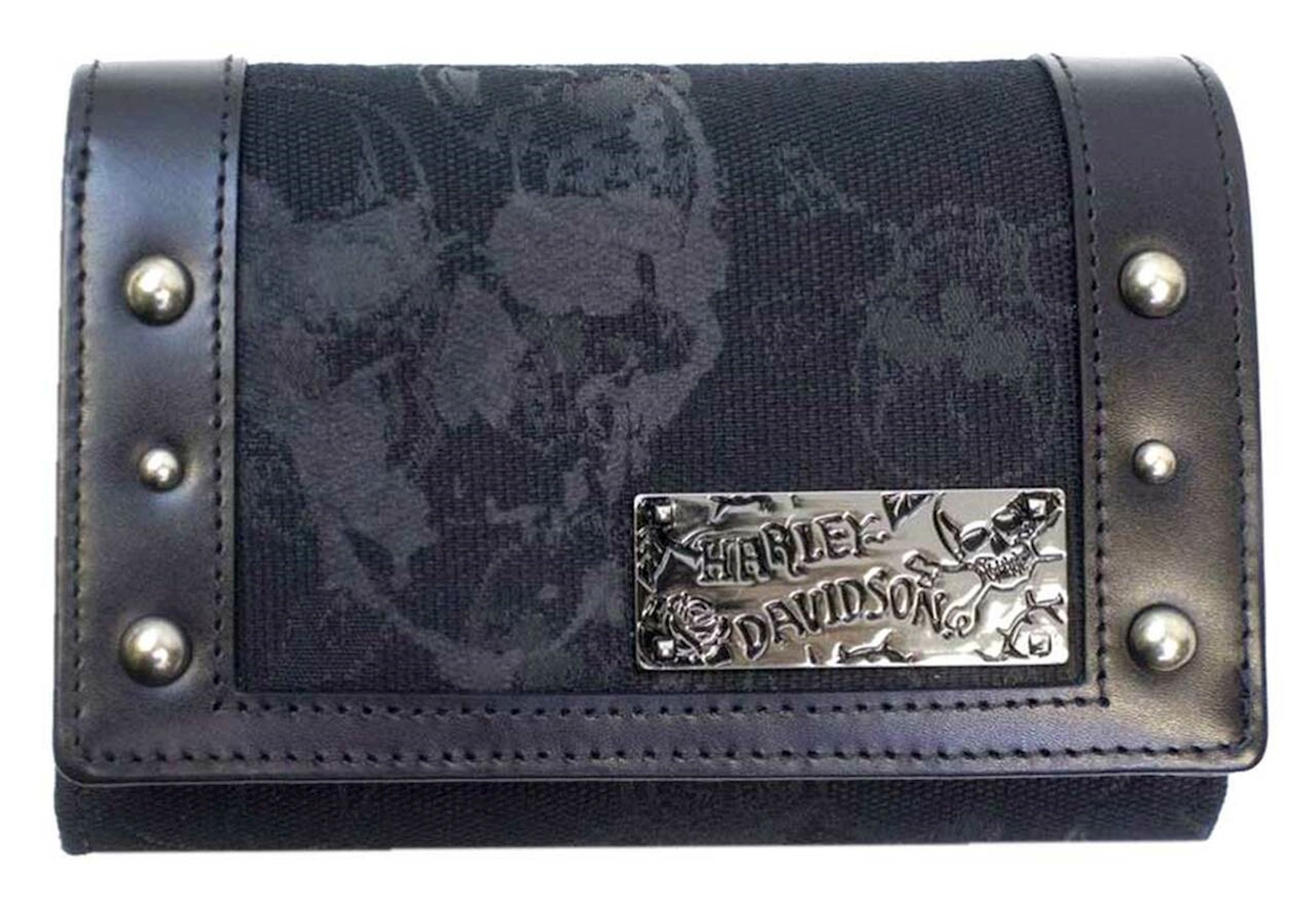 Harley-Davidson® Women's Skull Jacquard 6 in Tri-Fold Wallet, SJ4992J-BLACK. Part of the Black Skull Jacquard Collection. Beautiful wallet to add to your collection. Constructed from poly-cotton blended black skull jacquard that has been jersey backed and trimmed with smooth black genuine leather. Antique nickel Harley-Davidson® tattoo medallion and dome studs. Poly blend silver dagger printed lining. Interior features 7 credit card slots, 1 open cash pocket and zippered coin pocket. Size: 6" L x 4" H.