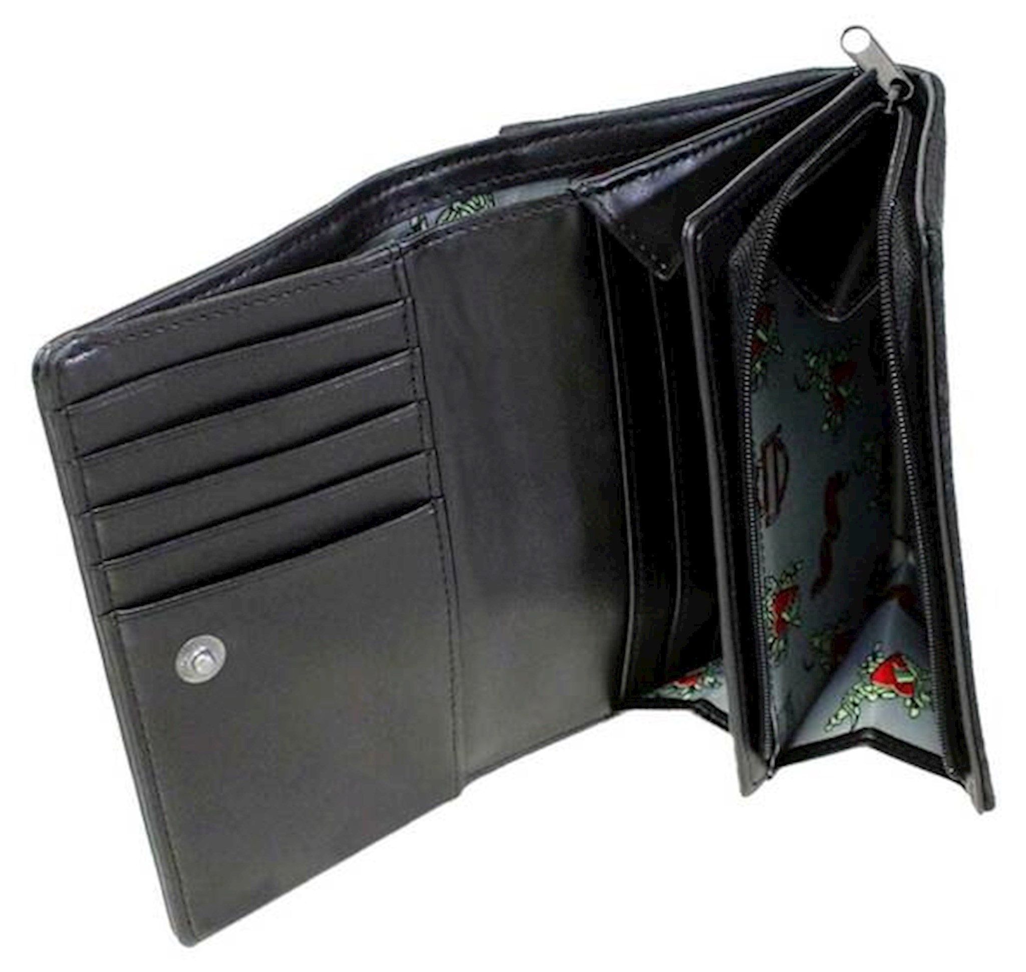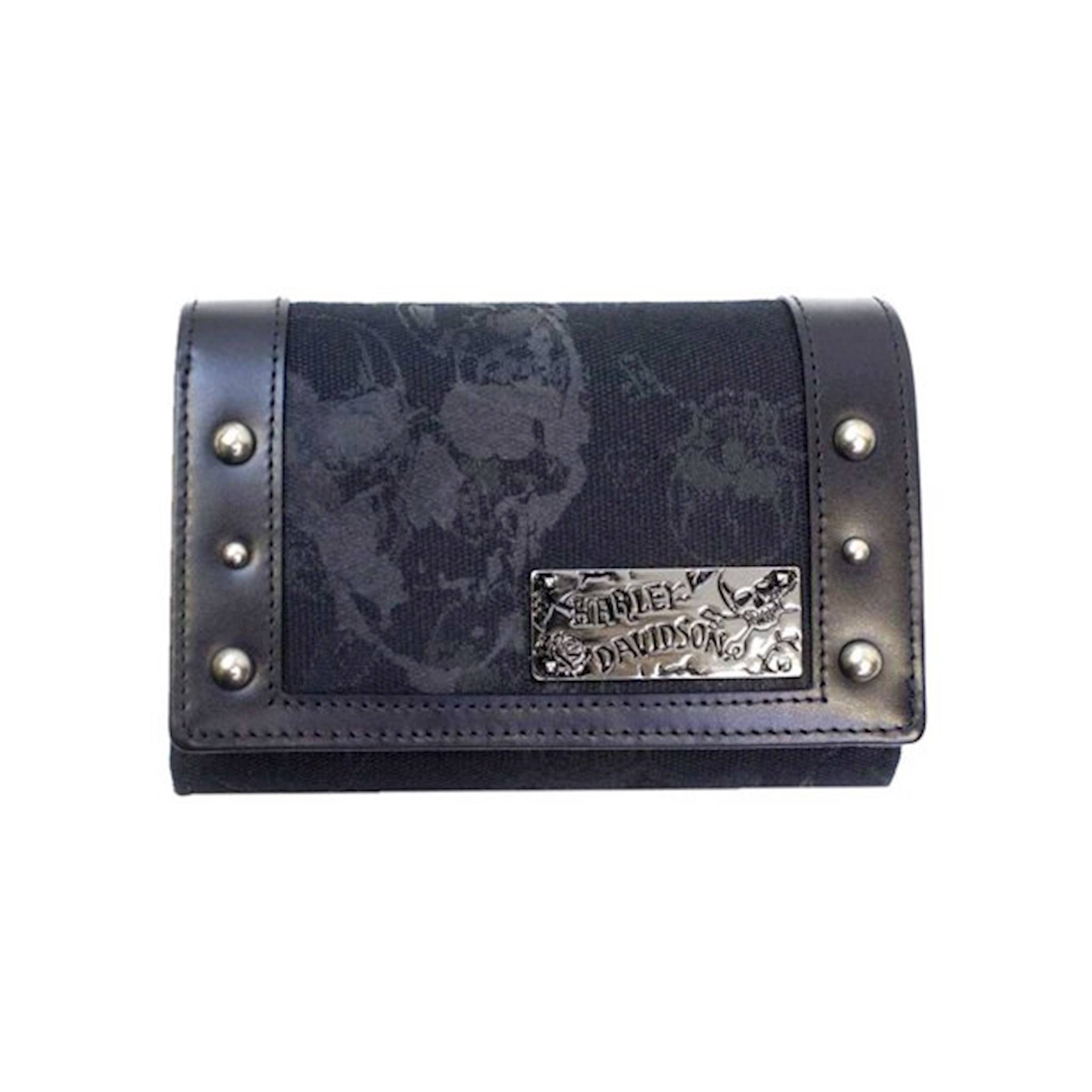 Harley-Davidson® Women's Skull Jacquard 6 in Tri-Fold Wallet, SJ4992J-BLACK. Part of the Black Skull Jacquard Collection. Beautiful wallet to add to your collection. Constructed from poly-cotton blended black skull jacquard that has been jersey backed and trimmed with smooth black genuine leather. Antique nickel Harley-Davidson® tattoo medallion and dome studs. Poly blend silver dagger printed lining. Interior features 7 credit card slots, 1 open cash pocket and zippered coin pocket. Size: 6" L x 4" H.