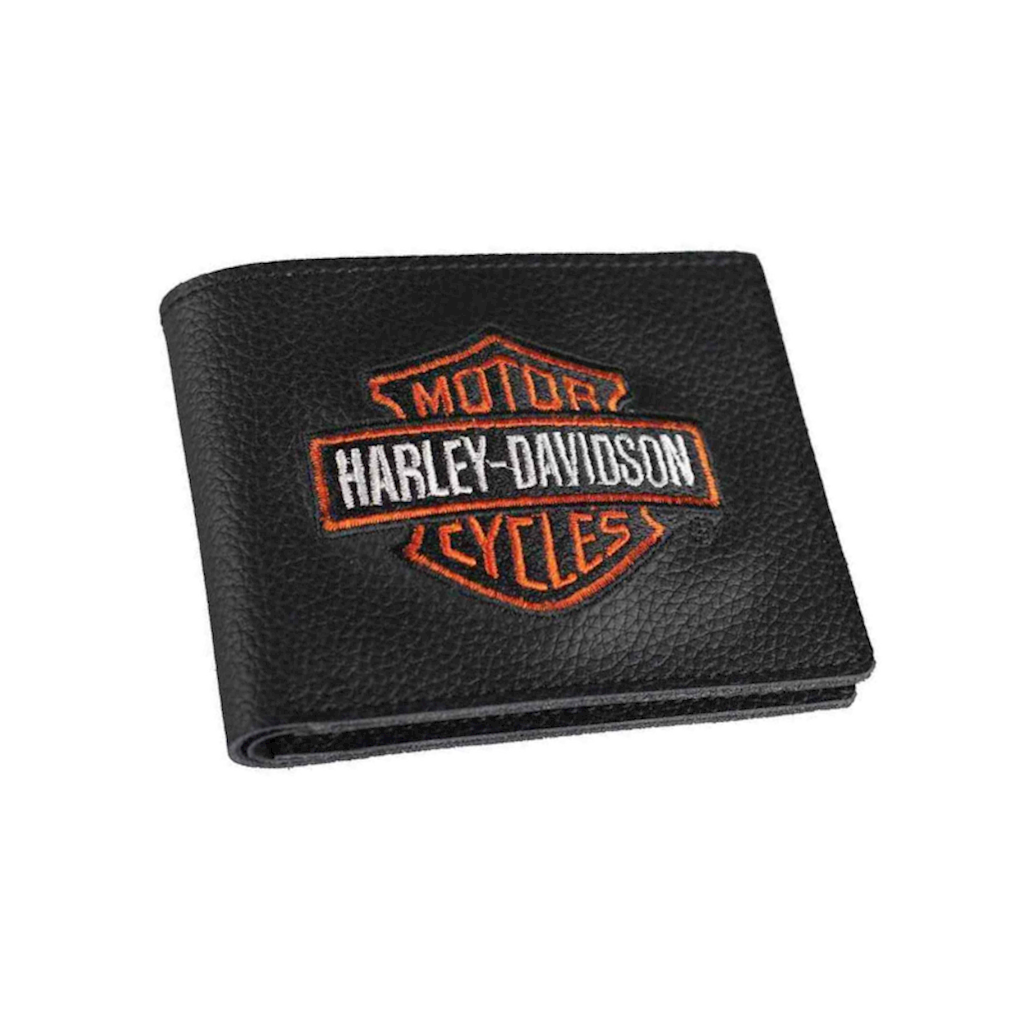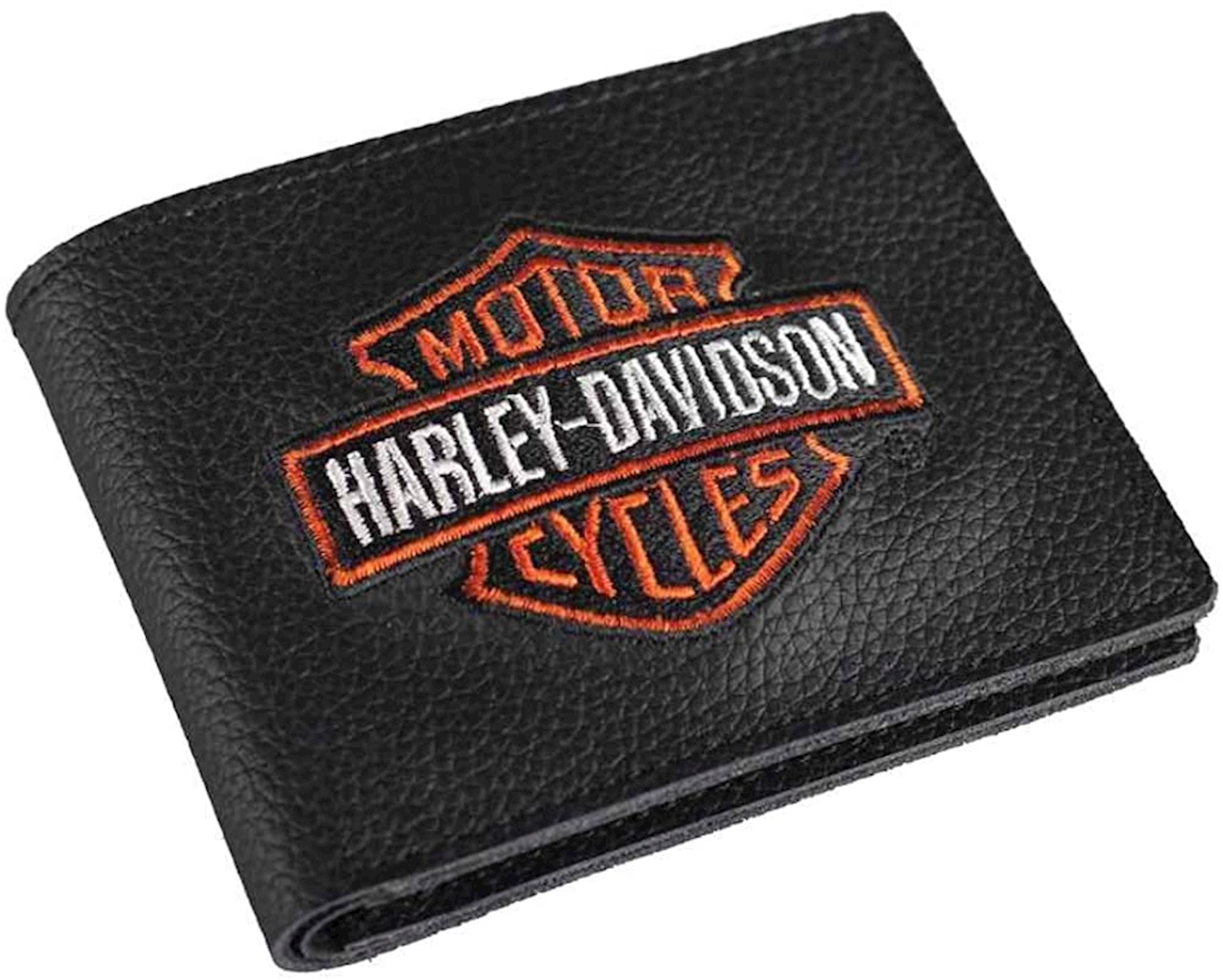 Harley-Davidson® men's embroidered billfold wallet. Black pebbled genuine leather. Features embroidered orange Bar and Shield logo Interior features 4 credit card slots, 1 ID card slot and 1 cash slot. Measures 4.25 inches in length and 3.5 inches in height.