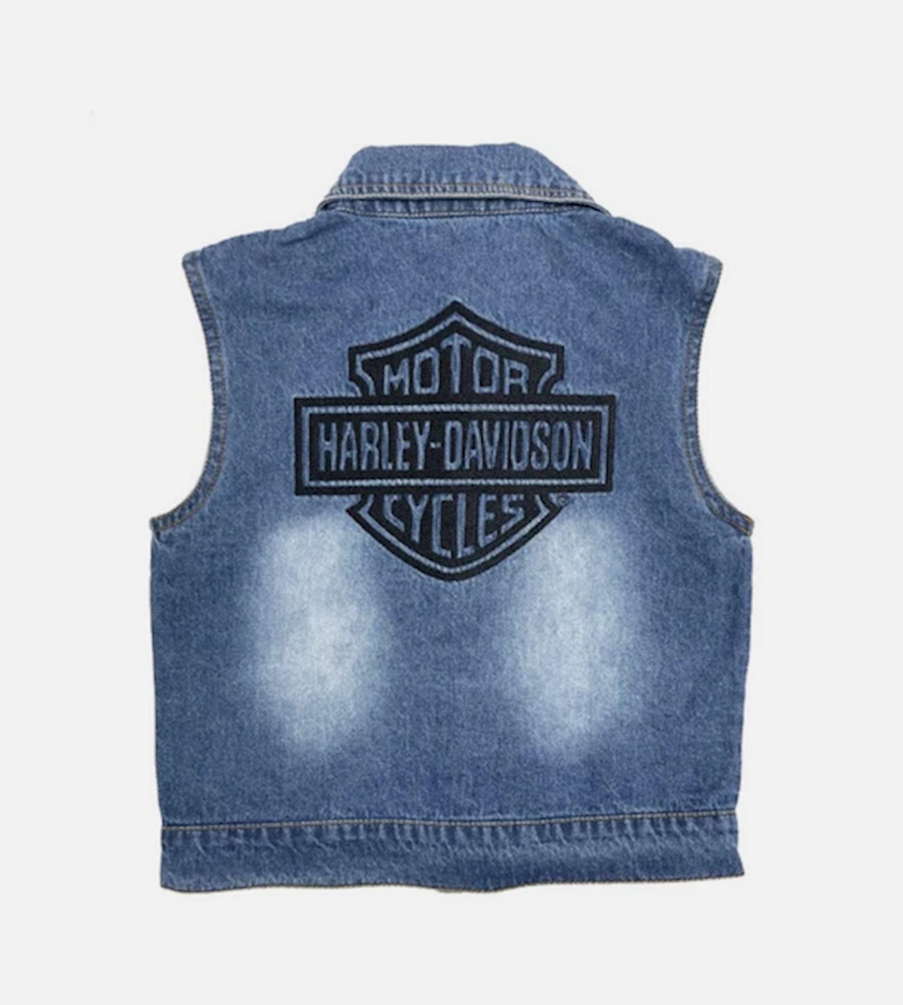 Harley-Davidson® Kids Denim Vest, 1071534. Made from 100% cotton. Embroidered Harley-Davidson® script on front chest. Oversized embroidered Bar & Shield logo on back. Full snap button front. Denim blue jean vest. Soft & Comfortable, made from 100% cotton. Embroidered Harley-Davidson® script on chest Oversized Bar & Shield logo embroidered on back. Snap button front. Blue Jean Denim.