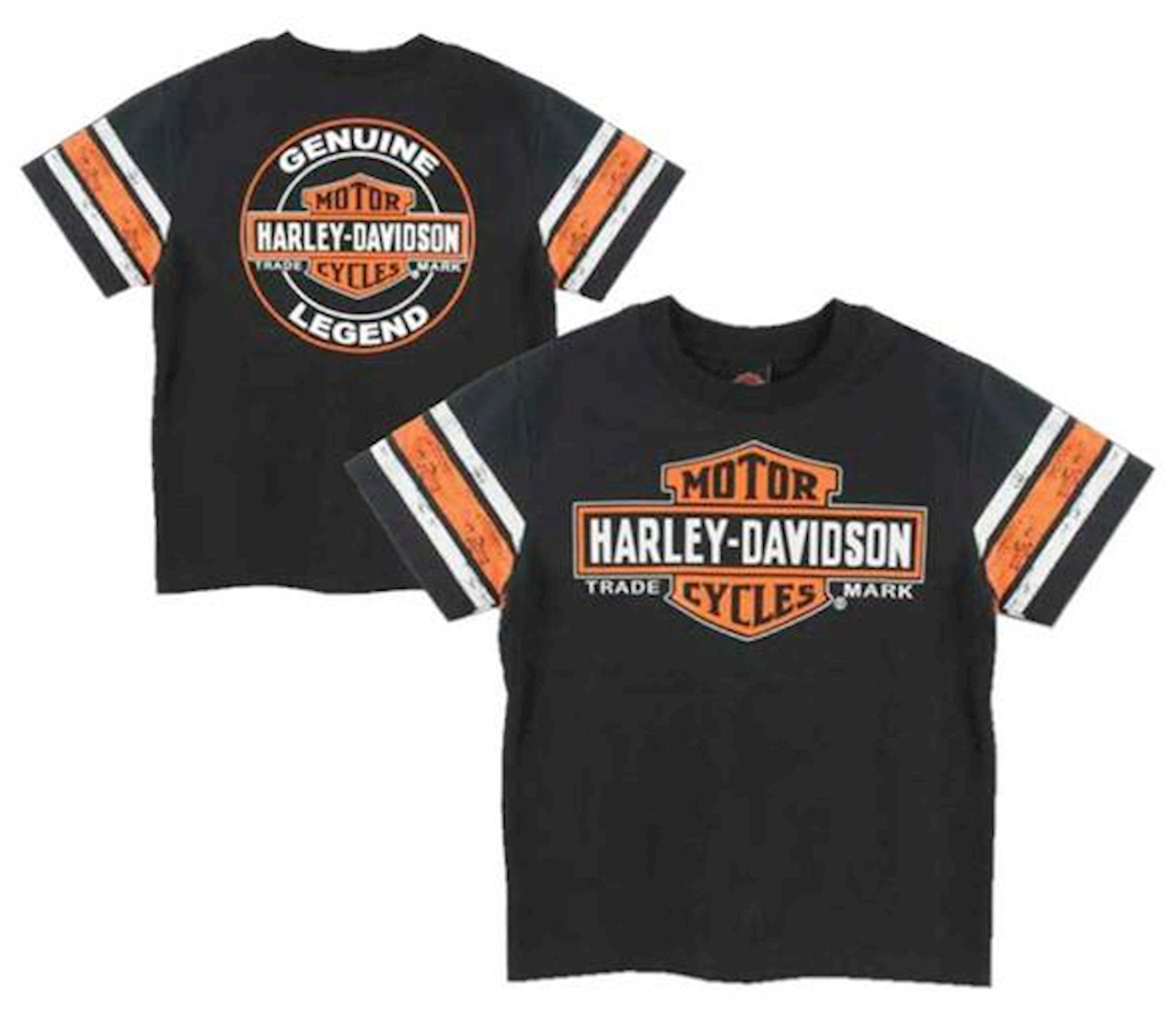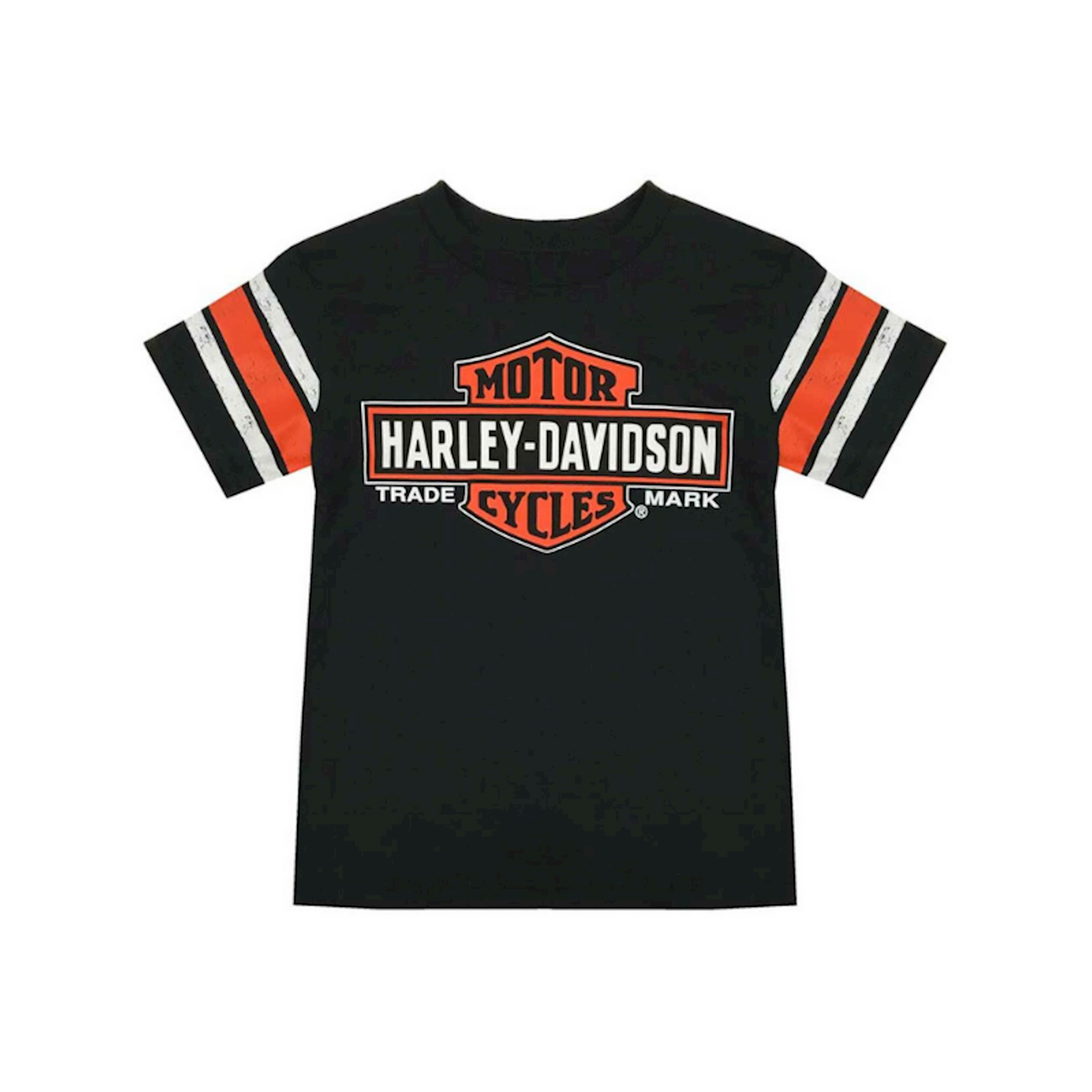 Harley-Davidson® Little Boys' Interlock Short Sleeve Tee - Black. Made from 100% cotton, very soft and comfortable for your little guy. Classic screen printed Bar & Shield graphics on front and back with distressed sleeve stripes. Accented with contrasting orange & white.