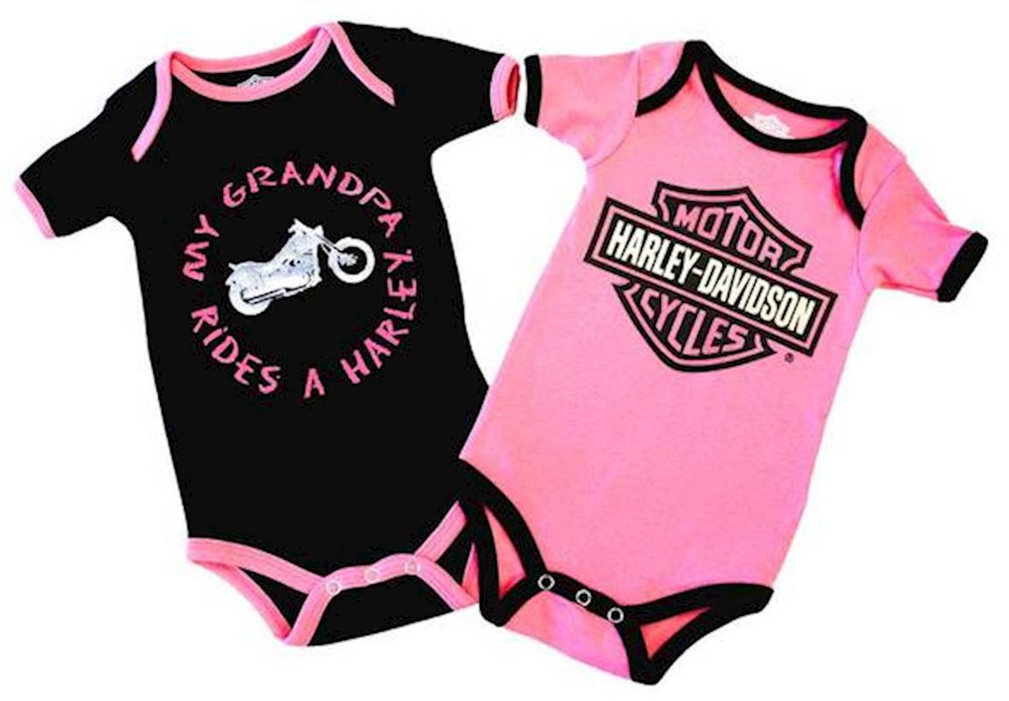 Harley-Davidson® Baby Girl’s Cotton Romper/Creeper Two Piece Set, 1103054. For that adorable biker baby girl in your life. It’s never too early to initiate your little one into her second family, Harley-Davidson®. Here we have two complete, 100% cotton crawlers. One is black, trimmed in pink and says, ''My Grandpa Rides a Harley. '' For the other, the colors are reversed: pink with black trim with a white and black Harley-Davidson® logo and the words, "Born to Ride." As with all things Harley® - these rompers are top shelf in design and in manufacturing quality. With folded envelope sleeves, your baby stays clean when pulling a soiled creeper off over the legs rather than over the head. Each creeper also has reinforced collars, sleeve caps, and leg cuffs, and a 3-snap crotch closure. Set of 2.