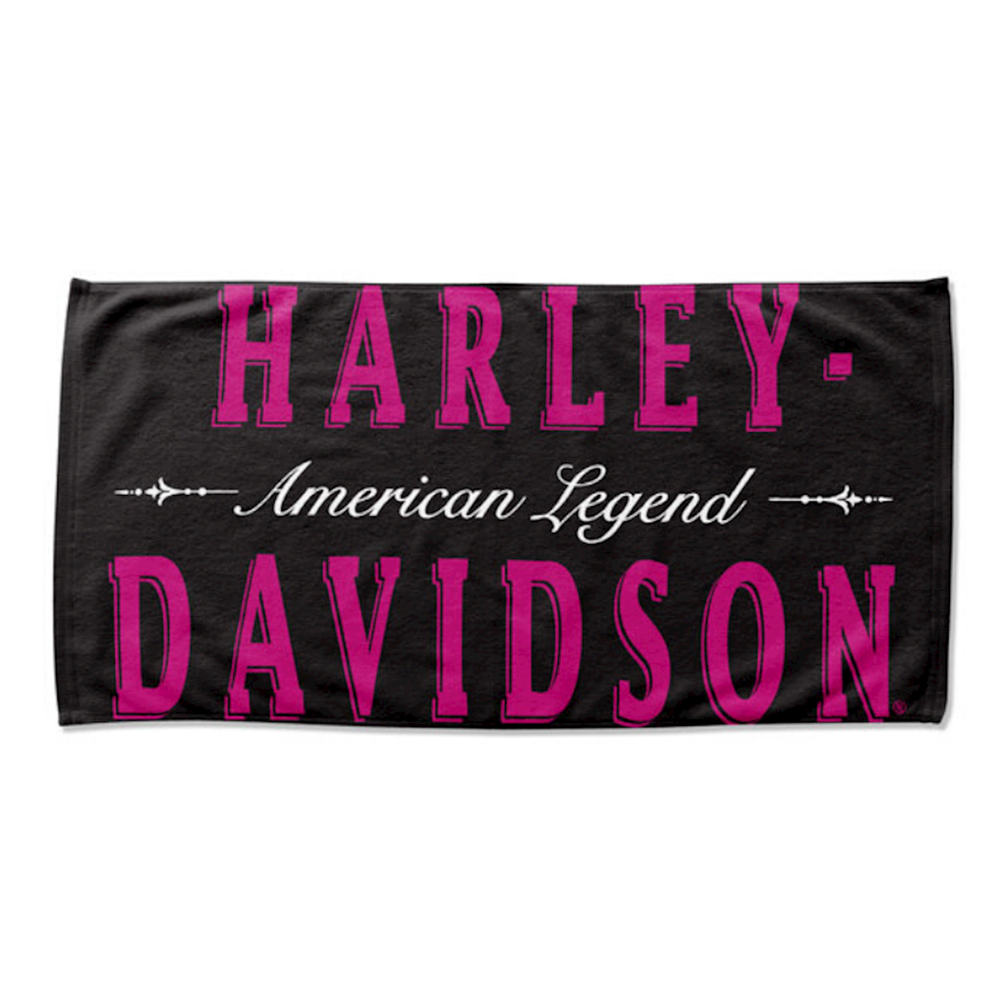 Harley-Davidson® Heirloom Beach Towel. Extremely soft, made of 52% cotton and 48% polyester. Features bold Harley-Davidson® script with beautiful "American Legend" design. Black beach towel with pink and white accents. Size: 30" x 60". Perfect towel for the beach or pool!
