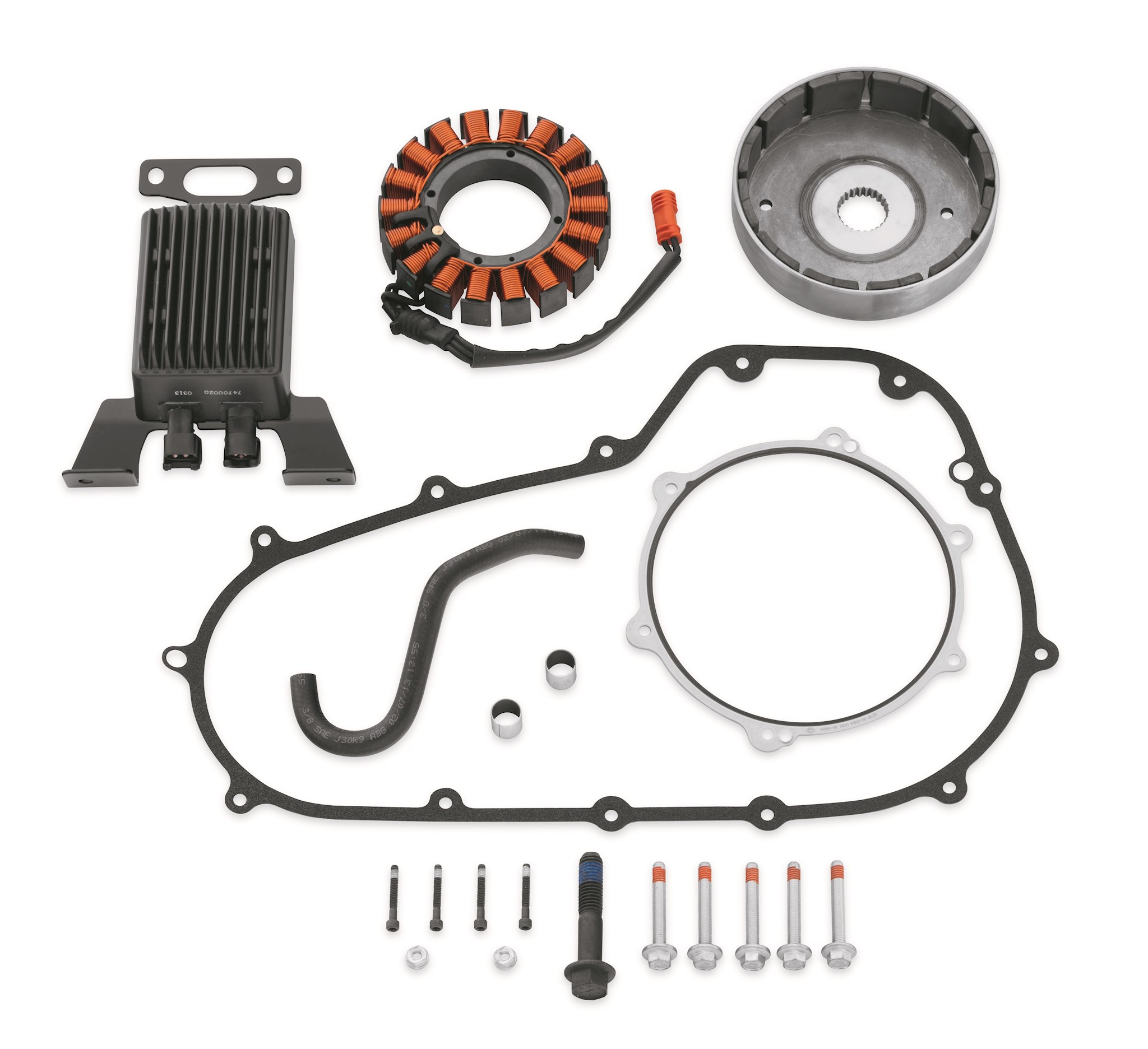 The Harley-Davidson® High Output Charging System is engineered to provide 30% more power than the stock system at idle. With 54 amps of output at 4000 rpm, accessories will operate at their peak performance - no more dimming lights, reduced audio performance or under-performing heated gear. This is a recommended installation anytime a multi-amp audio system is installed on the vehicle in order to achieve the full capability of your audio system. It is also recommended when installing headed seats, heated gear and other higher draw powered accessories. Stock on select CVO™ Touring models, the complete kit includes high performance rotor, stator, voltage regulator and all gaskets and hardware required for installation.