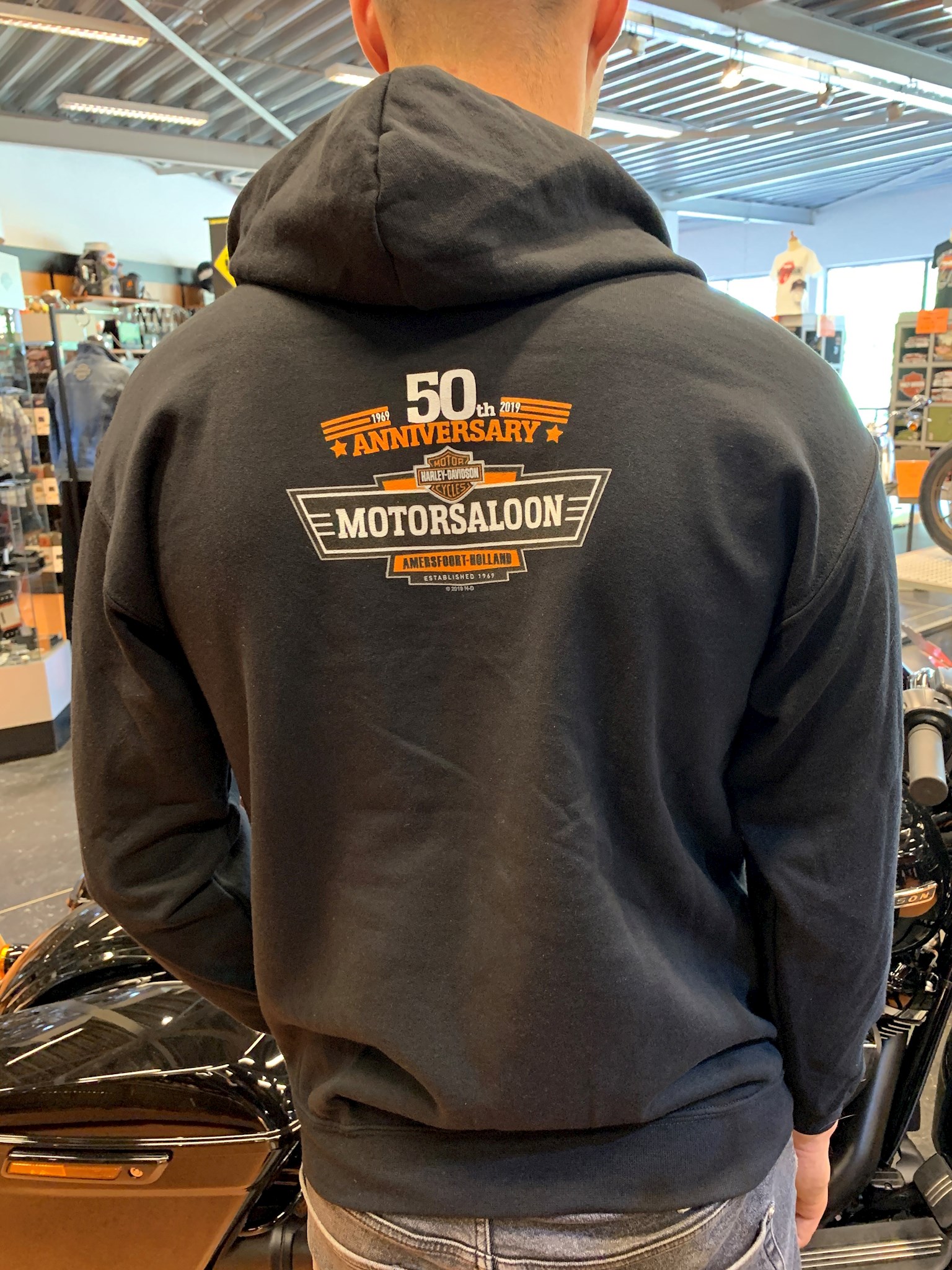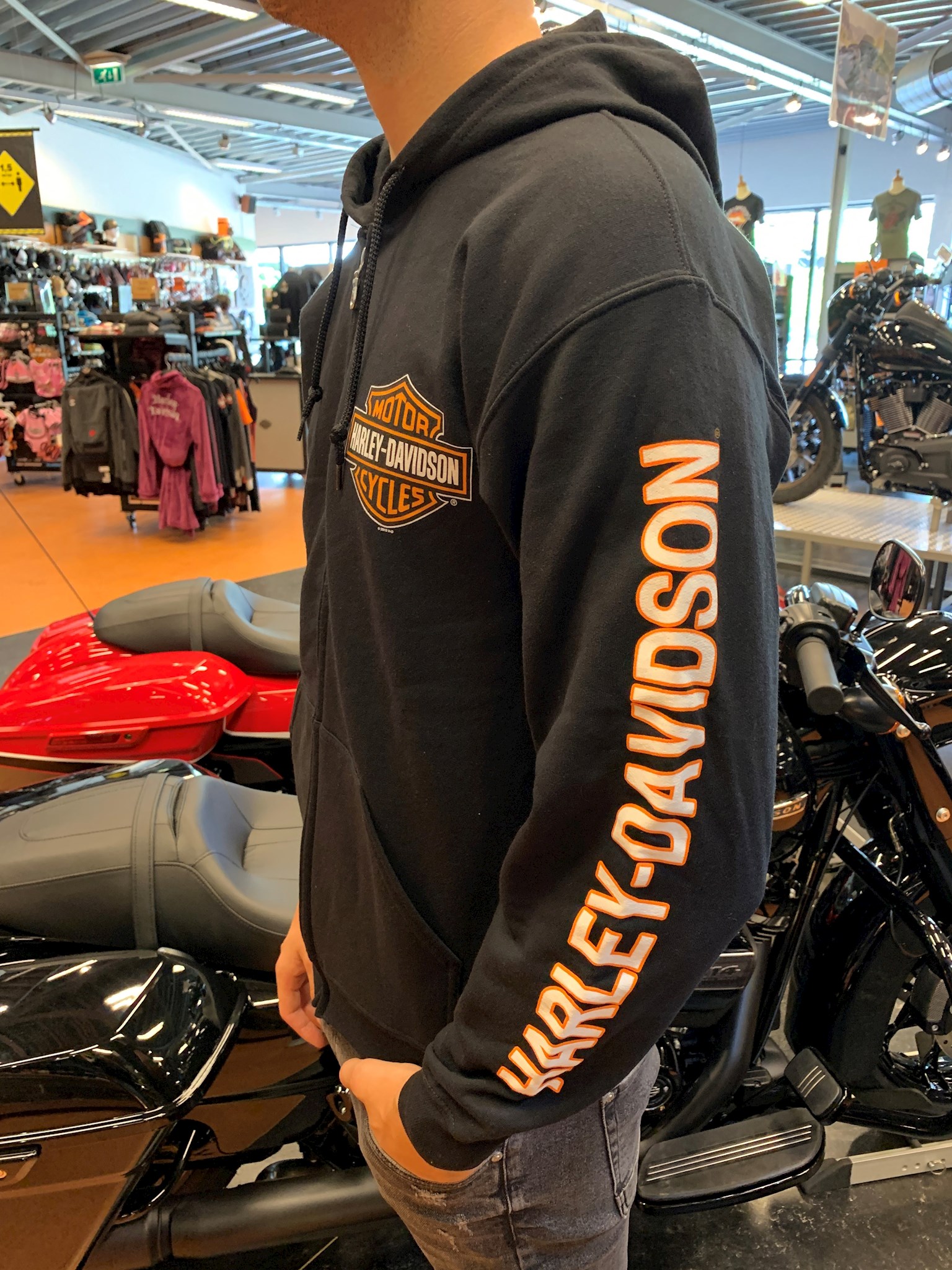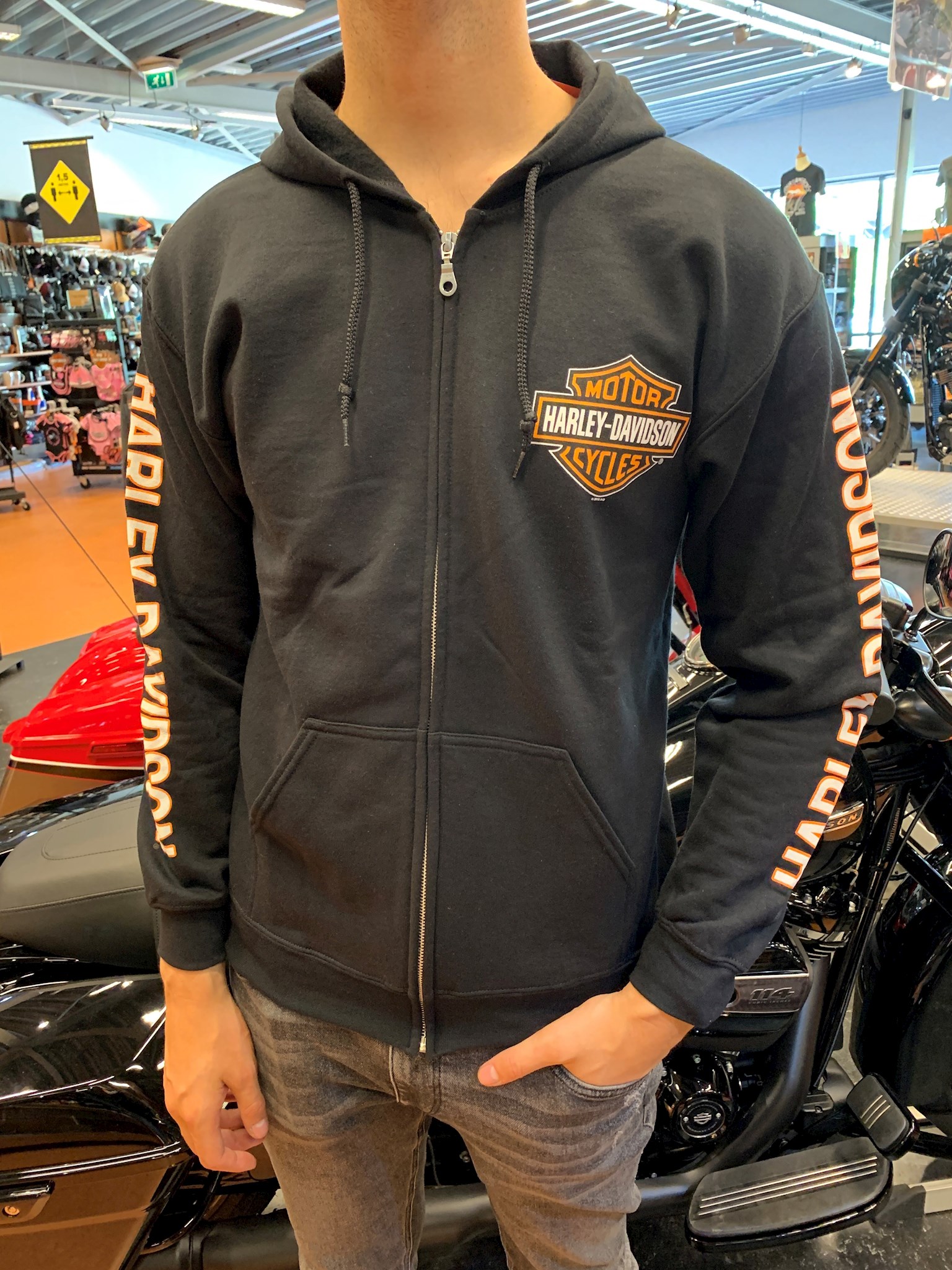 Own this timelessly styled Harley-Davidson® Men's Hooded Bar & Shield® Black Sweatshirt, 30299142. This hoodie has all the appointments you want, the graphic details, the right cotton blend, a zip front, and a hood. It's fashionable and comfortable on the road, at the clubhouse, while at work, or while just hanging around. The hoodie features a full front zipper and two hand warmer pockets. A Harley-Davidson® Bar & Shield® logo is on the left breast, complimented with block Harley® lettering down both arms, and the back has a Motor Saloon Harley-Davidson® logo. Made of 50% cotton and 50% polyester, this is sure to be a sweatshirt that you'll wear time and time again.