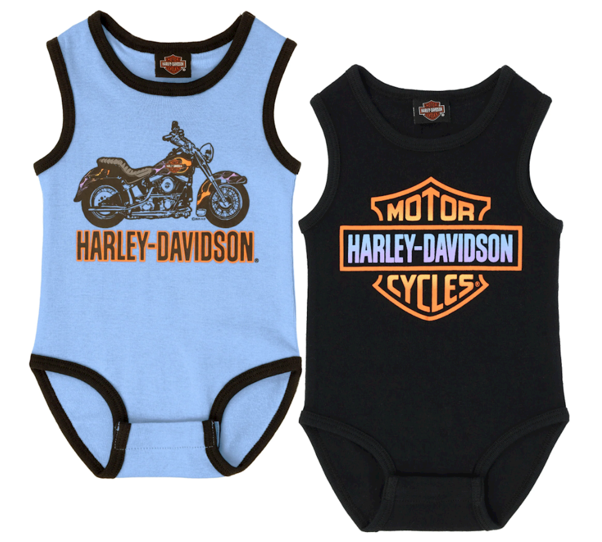 This two-piece sleeveless bodysuit set is made for comfort and style. One bodysuit is black with a bold orange Bar & Shield logo. The other is light blue with black trim, featuring a motorcycle graphic and “Harley-Davidson” text. Care Instructions: Machine Wash Cold with Like Colors; Tumble Dry Low