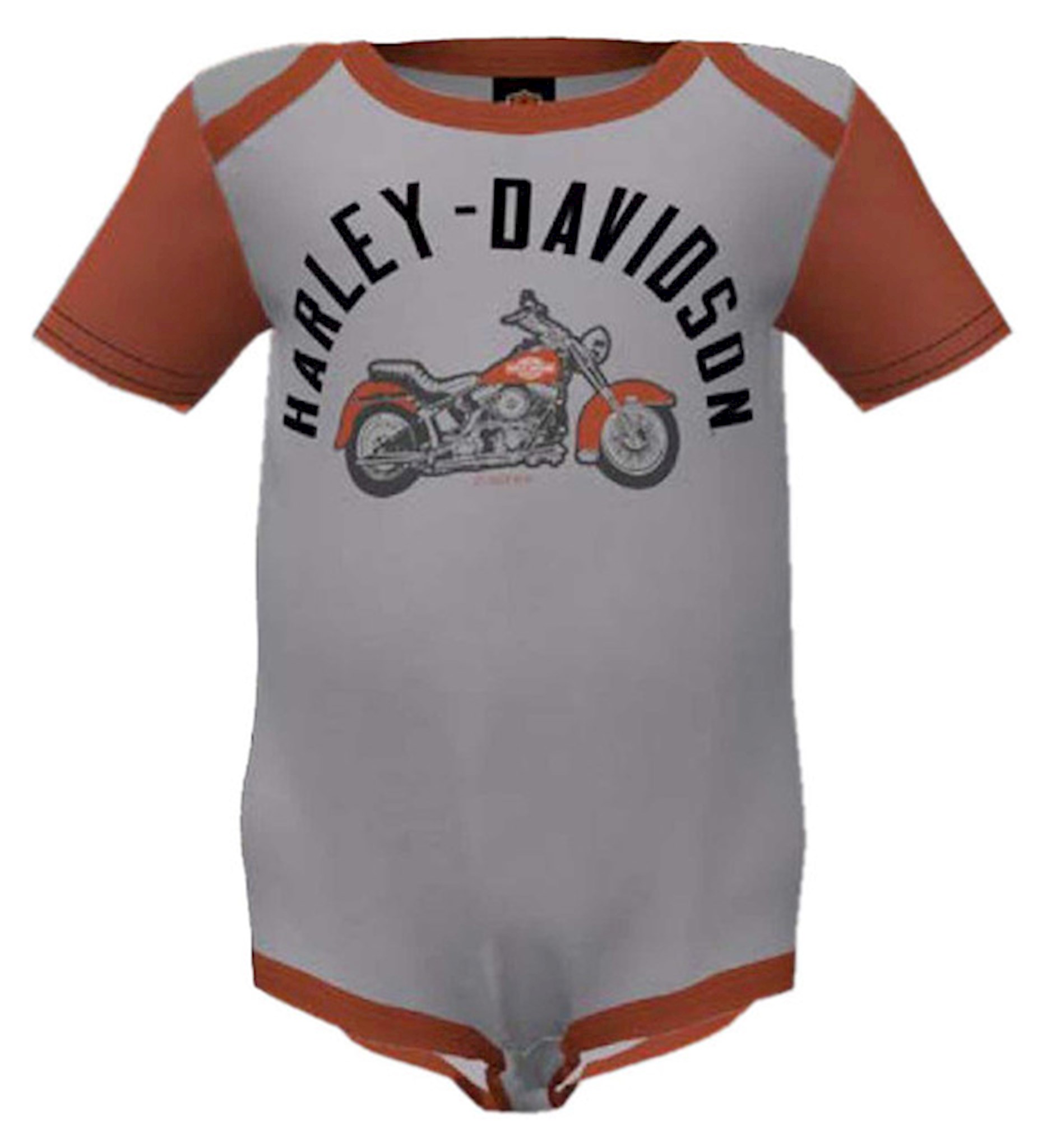 Harley-Davidson® Baby Boys' 2-Pack Colorblocked Motorcycle Rib Creeper Set, 3059236. Soft and comfortable, both are made from 60% cotton and 40% polyester. Iconic Bar & Shield logo and motorcycle graphic screen printed on each bodysuit. Three bottom snap closure. Both features contrasting orange trim and sleeves.